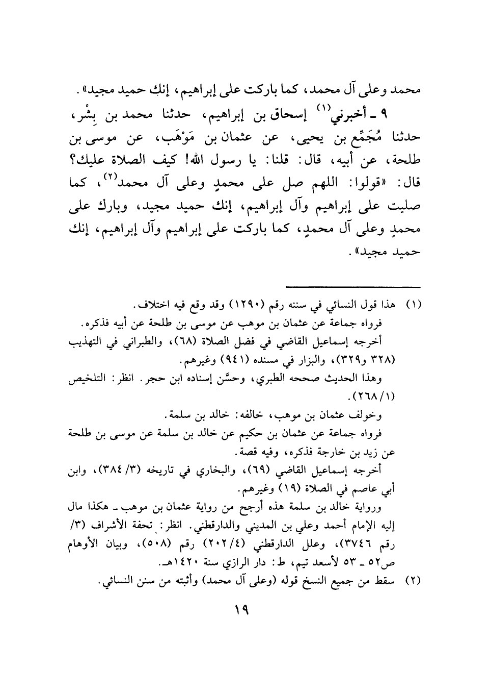 ٩ - أخبرني (¬١) إسحاق بن إبراهيم، حدثنا محمَّد بن بِشْر، حدثنا مُجَمِّع بن يحيى، عن عثمان بن مَوْهَب، عن موسى بن طلحة، عن أبيه، قال: قلنا: يا رسول الله! كيف الصلاة عليك؟ قال: "قولوا: اللهم صل على محمدٍ وعلى آل محمَّد (¬٢)، كما صليت على إبراهيم وآل إبراهيم، إنك حميد مجيد، وبارك على محمدٍ وعلى آل محمدٍ، كما باركت على إبراهيم وآل إبراهيم، إنك حميد مجيد".