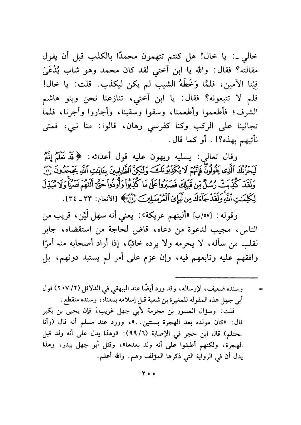 خالي-: يا خال! هل كنتم تتهمون محمدًا بالكذب قبل أن يقول مقالته؟ فقال: والله يا ابن أختي لقد كان محمد وهو شاب يُدْعَى فِيْنا الأمين، فلمَّا وَخَطَهُ الشيب لم يكن ليكذب. قلت: يا خال! فلم لا تتبعونه؟ فقال: يا ابن أختي، تنازعنا نحن وبنو هاشم الشرف؛ فأطعموا وأطعمنا، وسقوا وسقينا، وأجاروا وأجرنا، فلما تجاثينا على الركب وكنا كفرسي رهان، قالوا: منا نبي، فمتى نأتيهم بهذه؟!. أو كما قال.