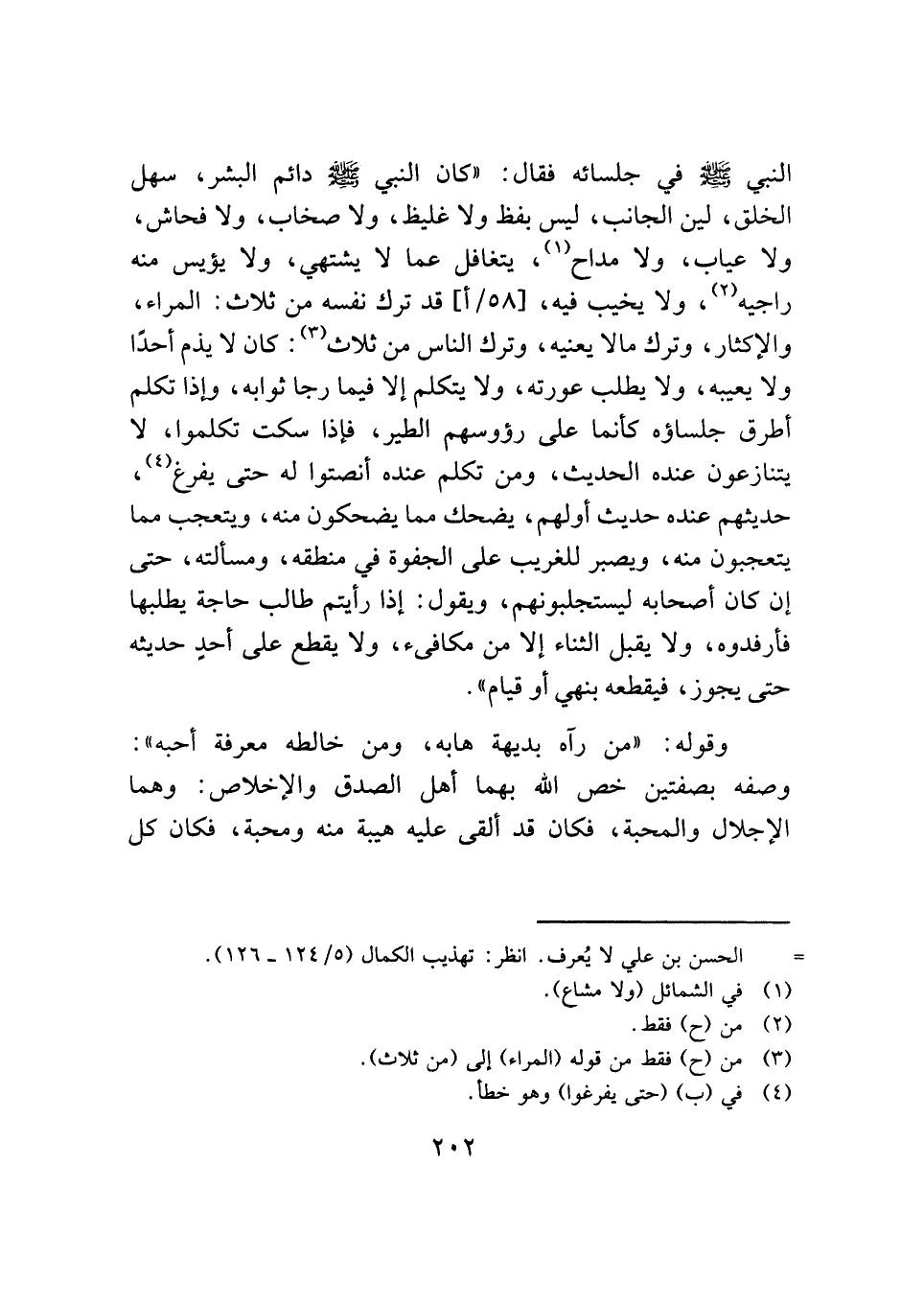 النبي - صلى الله عليه وسلم - في جلسائه فقال: "كان النبي - صلى الله عليه وسلم - دائم البشر، سهل الخلق، لين الجانب، ليس بفظ ولا غليظ، ولا صخاب، ولا فحاش، ولا عياب، ولا مداح (¬١)، يتغافل عما لا يشتهي، ولا يؤيس منه راجيه (¬٢)، ولا يخيب فيه، قد ترك نفسه من ثلاث: المراء، والإكثار، وترك ما لا يعنيه، وترك الناس من ثلاث (¬٣): كان لا يذم أحدًا ولا يعيبه، ولا يطلب عورته، ولا يتكلم إلا فيما رجا ثوابه، وإذا تكلم أطرق جلساؤه كأنما على رؤوسهم الطير، فإذا سكت تكلموا، لا يتنازعون عنده الحديث، ومن تكلم عنده أنصتوا له حتى يفرغ (¬٤)، حديثهم عنده حديث أولهم، يضحك مما يضحكون منه، ويتعجب مما يتعجبون منه، ويصبر للغريب على الجفوة في منطقه، ومسألته، حتى إن كان أصحابه ليستجلبونهم، ويقول: إذا رأيتم طالب حاجة يطلبها فأرفدوه، ولا يقبل الثناء إلا من مكافئ، ولا يقطع على أحدٍ حديثه حتى يجوز، فيقطعه بنهي أو قيام".
