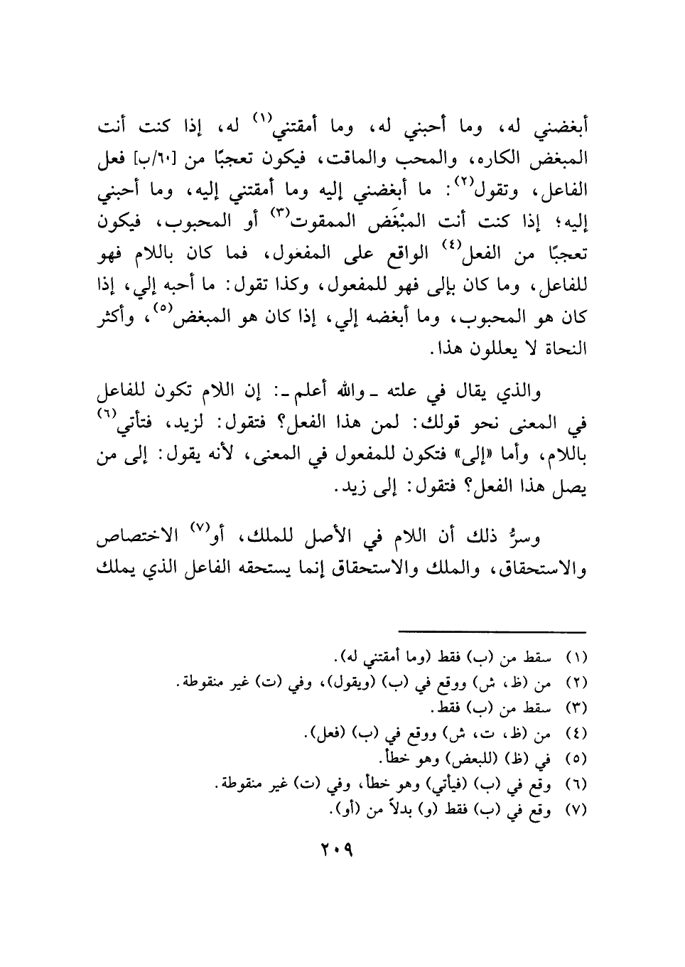 أبغضني له، وما أحبني له، وما أمقتني (¬١) له، إذا كنت أنت المبغض الكاره، والمحب والماقت، فيكون تعجبًا من فعل الفاعل، وتقول (¬٢): ما أبغضني إليه وما أمقتني إليه، وما أحبني إليه؛ إذا كنت أنت المبْغَض الممقوت (¬٣) أو المحبوب، فيكون تعجبًا من الفعل (¬٤) الواقع على المفعول، فما كان باللام فهو للفاعل، وما كان بإلى فهو للمفعول، وكذا تقول: ما أحبه إلي، إذا كان هو المحبوب، وما أبغضه إلي، إذا كان هو المبغض (¬٥)، وأكثر النحاة لا يعللون هذا.