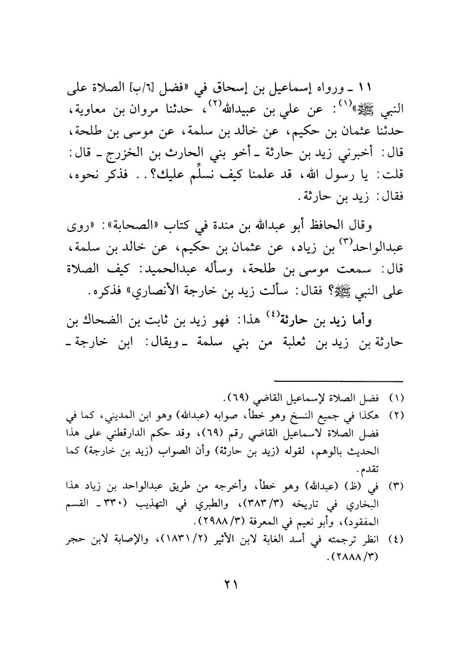 ١١ - ورواه إسماعيل بن إسحاق في "فضل الصلاة على النبي - صلى الله عليه وسلم -" (¬١): عن علي بن عبيد الله (¬٢)، حدثنا مروان بن معاوية، حدثنا عثمان بن حكيم، عن خالد بن سلمة، عن موسى بن طلحة، قال: أخبرني زيد بن حارثة - أخو بني الحارث بن الخزرج - قال: قلت: يا رسول الله، قد علمنا كيف نسلِّم عليك؟. . فذكر نحوه، فقال: زيد بن حارثة.