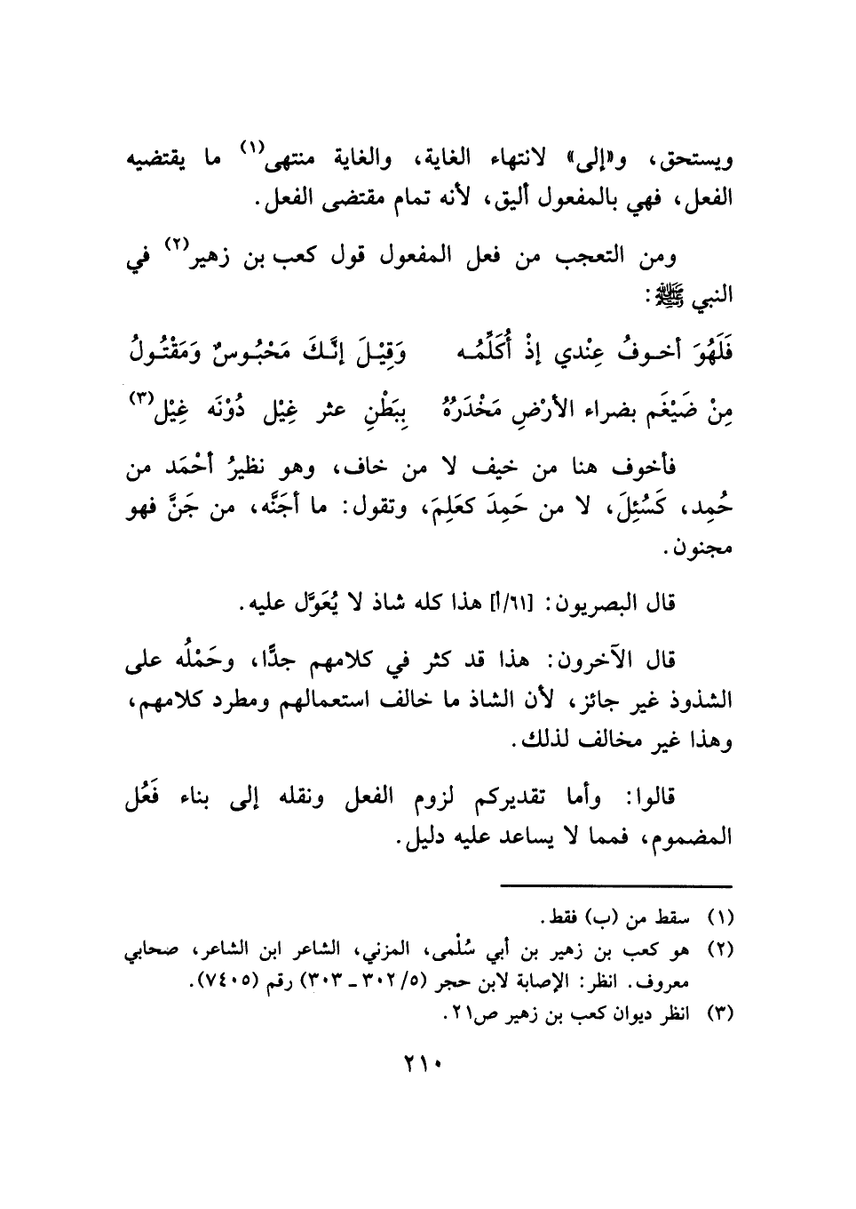 ومن التعجب من فعل المفعول قول كعب بن زهير (¬٢) في النبي - صلى الله عليه وسلم -: