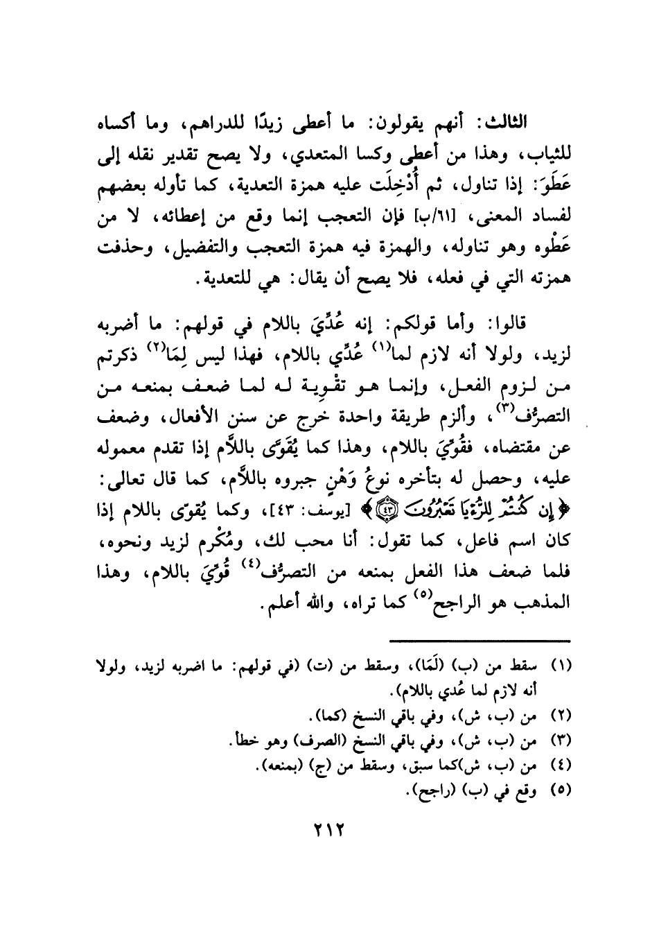 الثالث: أنهم يقولون: ما أعطى زيدًا للدراهم، وما أكساه للثياب، وهذا من أعطى وكسا المتعدي، ولا يصح تقدير نقله إلى عَطَوَ: إذا تناول، ثم أُدْخِلَت عليه همزة التعدية، كما تأوله بعضهم لفساد المعنى، فإن التعجب إنما وقع من إعطائه، لا من عَطْوه وهو تناوله، والهمزة فيه همزة التعجب والتفضيل، وحذفت همزته التي في فعله، فلا يصح أن يقال: هي للتعدية.