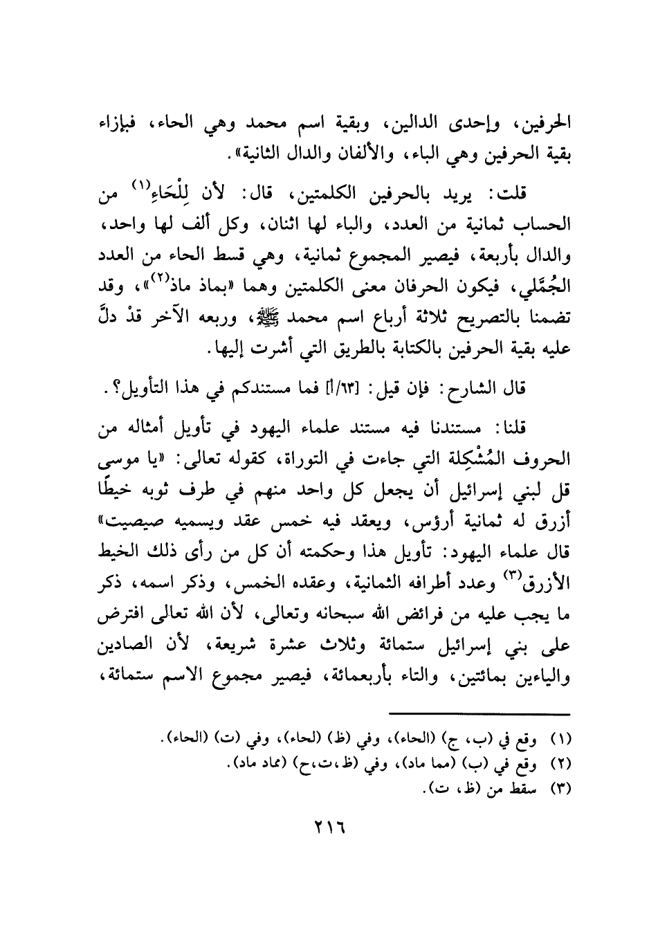 قلنا: مستندنا فيه مستند علماء اليهود في تأويل أمثاله من الحروف المُشْكِلة التي جاءت في التوراة، كقوله تعالى: "يا موسى قل لبني إسرائيل أن يجعل كل واحد منهم في طرف ثوبه خيطًا أزرق له ثمانية أرؤس، ويعقد فيه خمس عقد ويسميه صيصيت" قال علماء اليهود: تأويل هذا وحكمته أن كل من رأى ذلك الخيط الأزرق (¬٣) وعدد أطرافه الثمانية، وعقده الخمس، وذكر اسمه، ذكر ما يجب عليه من فرائض الله سبحانه وتعالى، لأن الله تعالى افترض على بني إسرائيل ستمائة وثلاث عشرة شريعة، لأن الصادين والياءين بمائتين، والياء بأربعمائة، فيصير مجموع الاسم ستمائة،