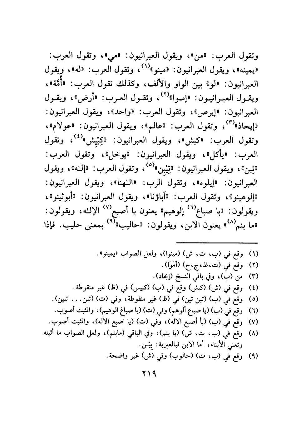 وتقول العرب: "من"، ويقول العبرانيون: "مي"، وتقول العرب: "يمينه"، ويقول العبرانيون: "مينو" (¬١)، وتقول العرب: "له"، ويقول العبرانيون: "لو" بين الواو والألف، وكذلك تقول العرب: "أمَّة"، ويقول العبرانيون: "إموا" (¬٢)، وتقول العرب: "أرض"، ويقول العبرانيون: "إيرض"، وتقول العرب: "واحد"، ويقول العبرانيون: "إيحاذ" (¬٣)، وتقول العرب: "عالم"، ويقول العبرانيون: "عولام"، وتقول العرب: "كيس"، ويقول العبرانيون: "كِيَيِش" (¬٤)، وتقول العرب: "يأكل"، ويقول العبرانيون: "يوخل"، وتقول العرب: "تين"، ويقول العبرانيون: "تِيْبِن" (¬٥)، وتقول العرب "إله"، ويقول العبرانيون: "أولوه"، وتقول الرب: "الهنا"، ويقول العبرانيون: "ألوهينو"، وتقول العرب: "أبانا"، ويقول العبرانيون: "أبوتينا"، ويقولون: "يا صباع (¬٦) إلوهيم" يعنون با أصبع (¬٧) الإله، ويقولون: "ما بنم (¬٨) " يعنون الابن، ويقولون: "حاليب" (¬٩) بمعنى حليب. فإذا