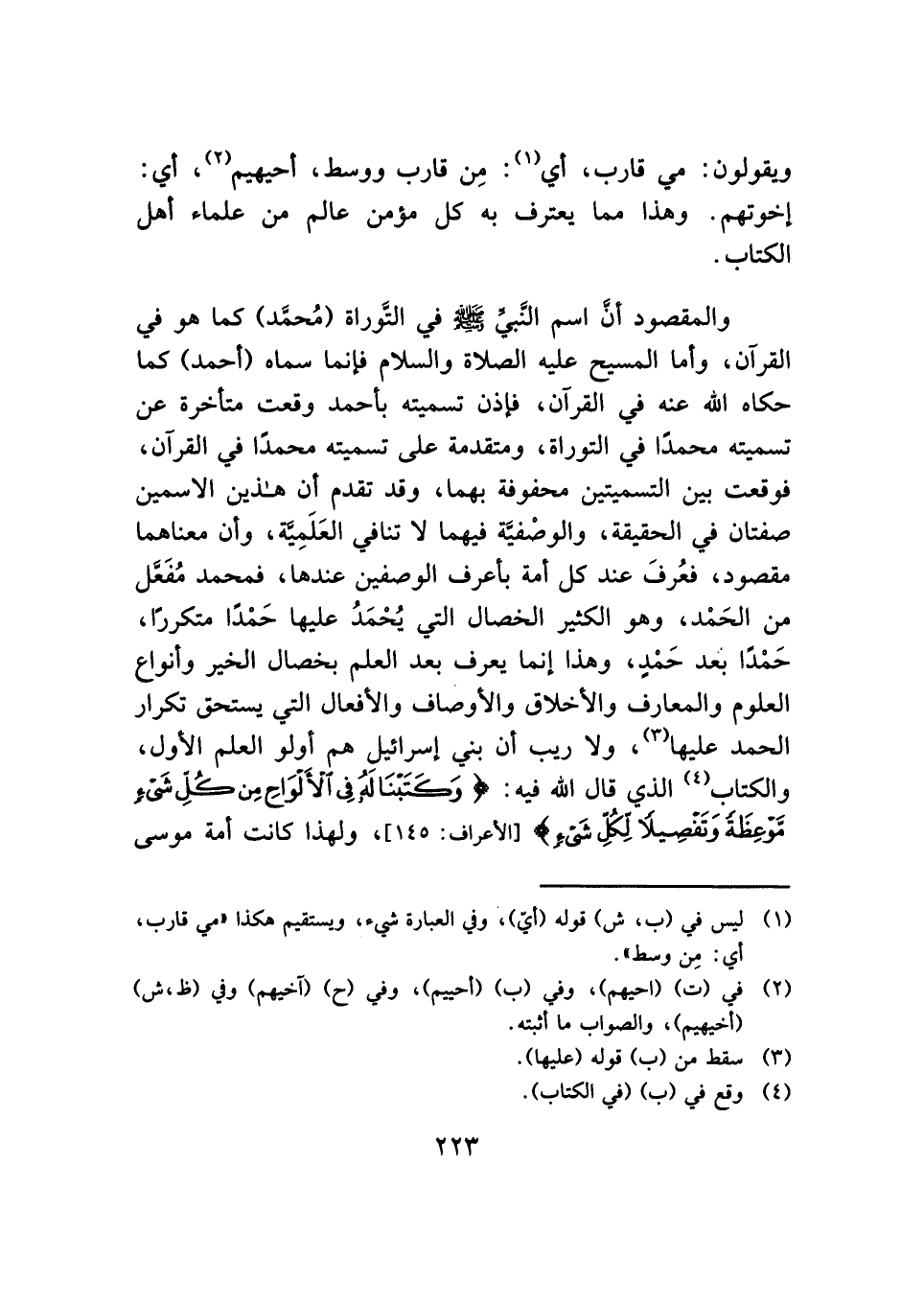 والمقصود أنَّ اسم النَّبيِّ - صلى الله عليه وسلم - في التَّوراة (مُحمَّد) كما هو في القرآن، وأما المسيح عليه الصلاة والسلام فإنما سماه (أحمد) كما حكاه الله عنه في القرآن، فإذن تسميته بأحمد وقعت متأخرة عن تسميته محمدًا في التوراة، ومتقدمة على تسميته محمدًا في القرآن، فوقعت بين التسميتين محفوفة بهما، وقد تقدم أن هذين الاسمين صفتان في الحقيقة، والوصْفيَّة فيهما لا تنافي العَلَمِيَّة، وأن معناهما مقصود، فعُرفَ عند كل أمة بأعرف الوصفين عندها، فمحمد مُفَعَّل من الحَمْد، وهو الكثير الخصال التي يُحْمَدُ عليها حَمْدًا متكررًا، حَمْدًا بعد حَمْدٍ، وهذا إنما يعرف بعد العلم بخصال الخير وأنواع العلوم والمعارف والأخلاق والأوصاف والأفعال التي يستحق تكرار الحمد عليها (¬٣)، ولا ريب أن بني إسرائيل هم أولو العلم الأول، والكتاب (¬٤) الذي قال الله فيه: {وَكَتَبْنَا لَهُ فِي الْأَلْوَاحِ مِنْ كُلِّ شَيْءٍ مَوْعِظَةً وَتَفْصِيلًا لِكُلِّ شَيْءٍ} [الأعراف: ١٤٥]، ولهذا كانت أمة موسى