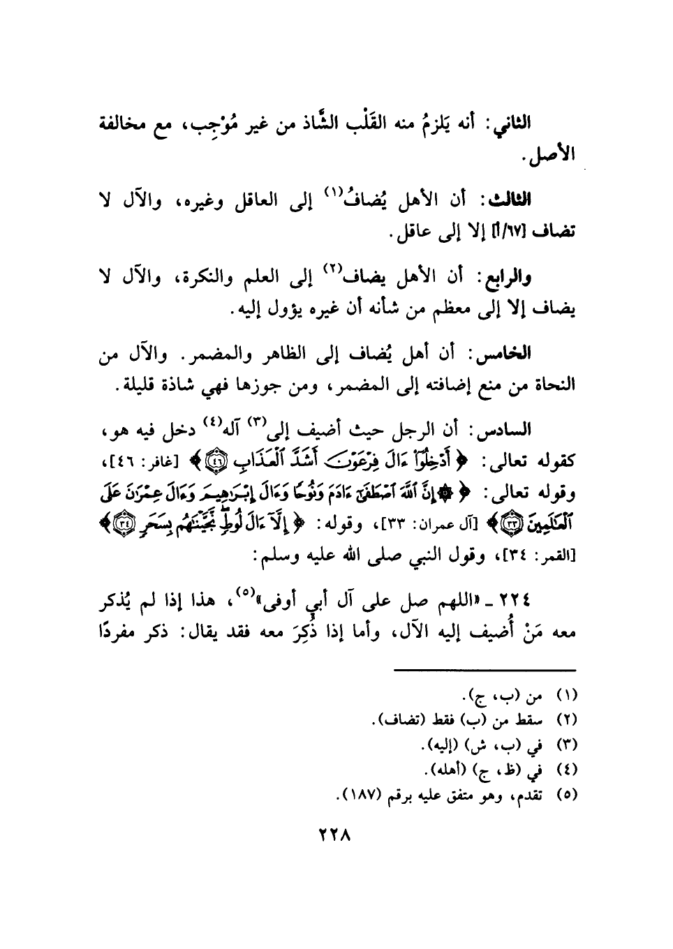 ٢٢٤ - "اللهم صل على آل أبي أوفى" (¬٥)، هذا إذا لم يُذكر معه مَنْ أُضيف إليه الآل، وأما إذا ذُكِرَ معه فقد يقال: ذكر مفردًا
