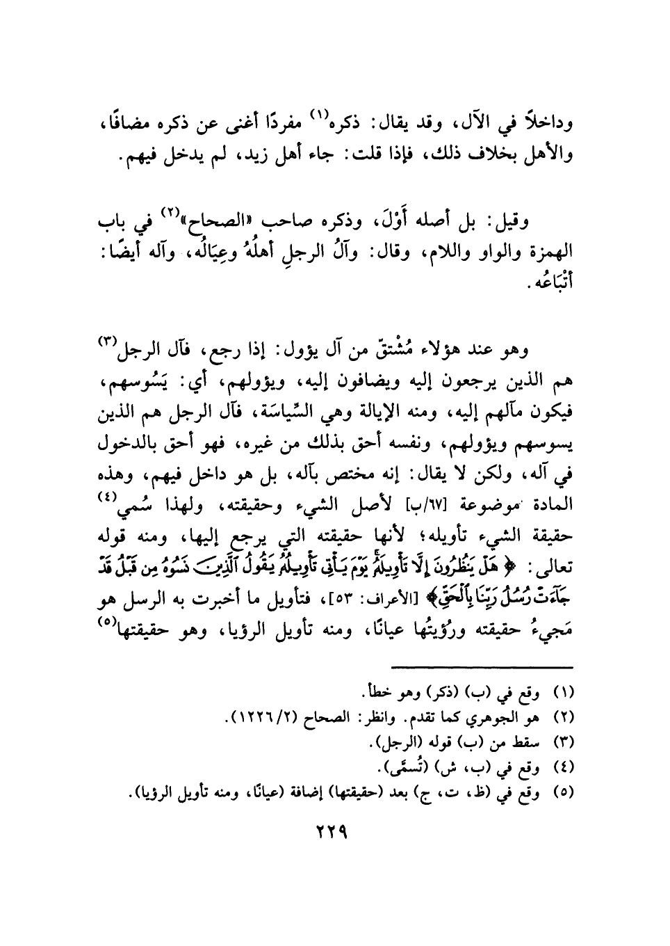 وهو عند هؤلاء مُشْتقّ من آل يؤول: إذا رجع، فآل الرجل (¬٣) هم الذين يرجعون إليه ويضافون إليه، ويؤولهم، أي: يَسُوسهم، فيكون مآلهم إليه، ومنه الإيالة وهي السِّياسَة، فآل الرجل هم الذين يسوسهم ويؤولهم، ونفسه أحق بذلك من غيره، فهو أحق بالدخول في آله، ولكن لا يقال: إنه مختص بآله، بل هو داخل فيهم، وهذه المادة موضوعة لأصل الشيء وحقيقته، ولهذا سُمي (¬٤) حقيقة الشيء تأويله؛ لأنها حقيقته التي يرجع إليها، ومنه قوله تعالى: {هَلْ يَنْظُرُونَ إِلَّا تَأْوِيلَهُ يَوْمَ يَأْتِي تَأْوِيلُهُ يَقُولُ الَّذِينَ نَسُوهُ مِنْ قَبْلُ قَدْ جَاءَتْ رُسُلُ رَبِّنَا بِالْحَقِّ} [الأعراف: ٥٣]، فتأويل ما أخبرت به الرسل هو مَجيءُ حقيقته ورُؤيتُها عيانًا، ومنه تأويل الرؤيا، وهو حقيقتها (¬٥)