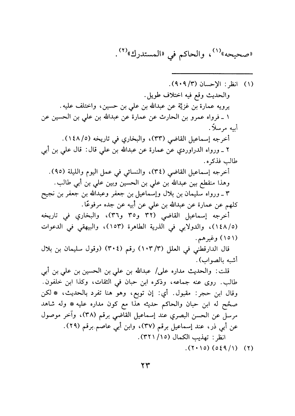قلت: والحديث مداره على/ عبد الله بن علي بن الحسين بن علي بن أبي طالب. روى عنه جماعه، وذكره ابن حبَّان في الثقات، وكذا ابن خلفون. وقال ابن حجر: مقبول. أي: إن توبع، وهو هنا تفرد بالحديث، * لكن صحَّح له ابن حبَّان والحاكم حديثه هذا مع كون مداره عليه * وله شاهد مرسل عن الحسن البصري عند إسماعيل القاضي برقم (٣٨)، وآخر موصول عن أبي ذر، عند إسماعيل برقم (٣٧)، وابن أبي عاصم برقم (٢٩).