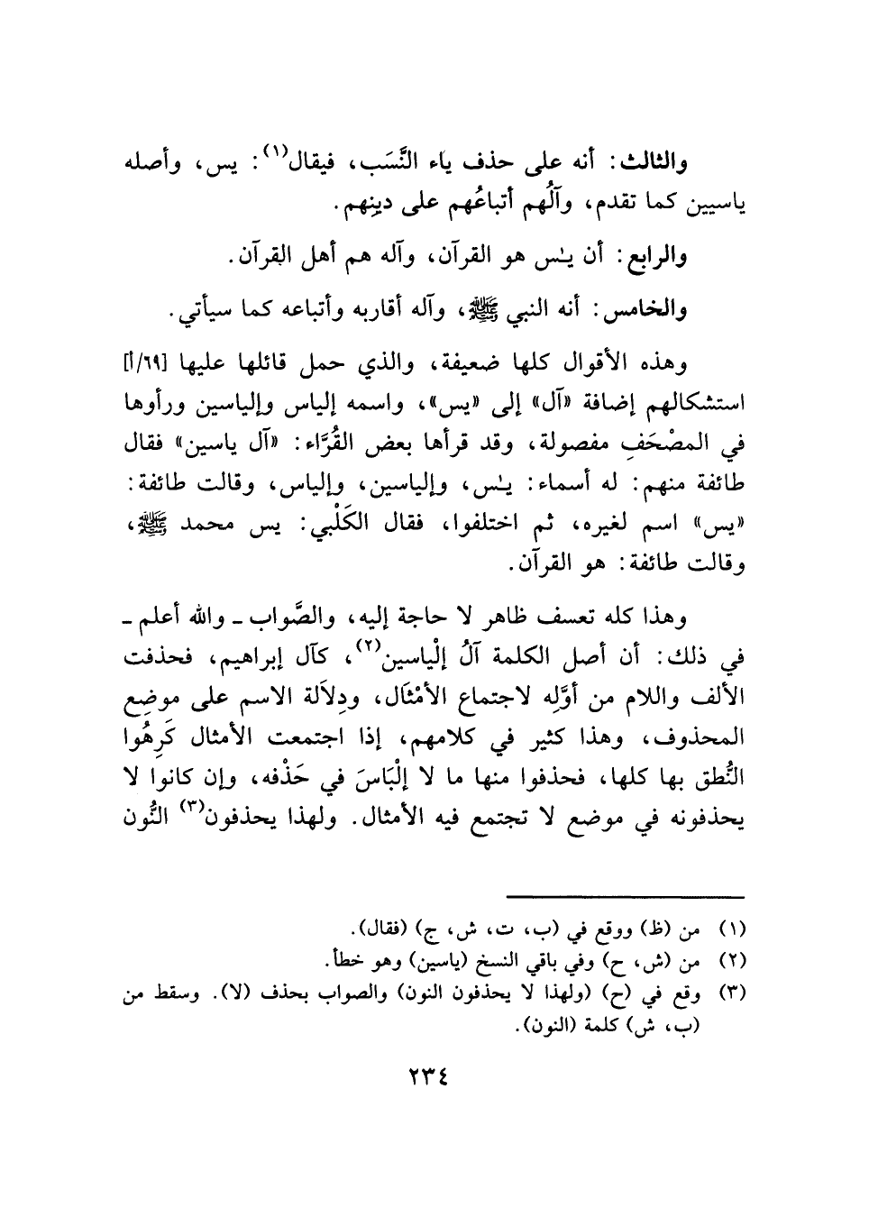 وهذا كله تعسف ظاهر لا حاجة إليه، والصَّواب -والله أعلم- في ذلك: أن أصل الكلمة آلُ إلْياسين (¬٢)، كآل إبراهيم، فحذفت الألف واللام من أوَّلِه لاجتماع الأمْثَال، ودِلَالة الاسم على موضِع المحذوف، وهذا كثير في كلامهم، إذا اجتمعت الأمثال كَرِهُوا النُّطق بها كلها، فحذفوا منها ما لا إلْبَاسَ في حَذْفه، وإن كانوا لا يحذفونه في موضع لا تجتمع فيه الأمثال. ولهذا يحذفون (¬٣) النُّون