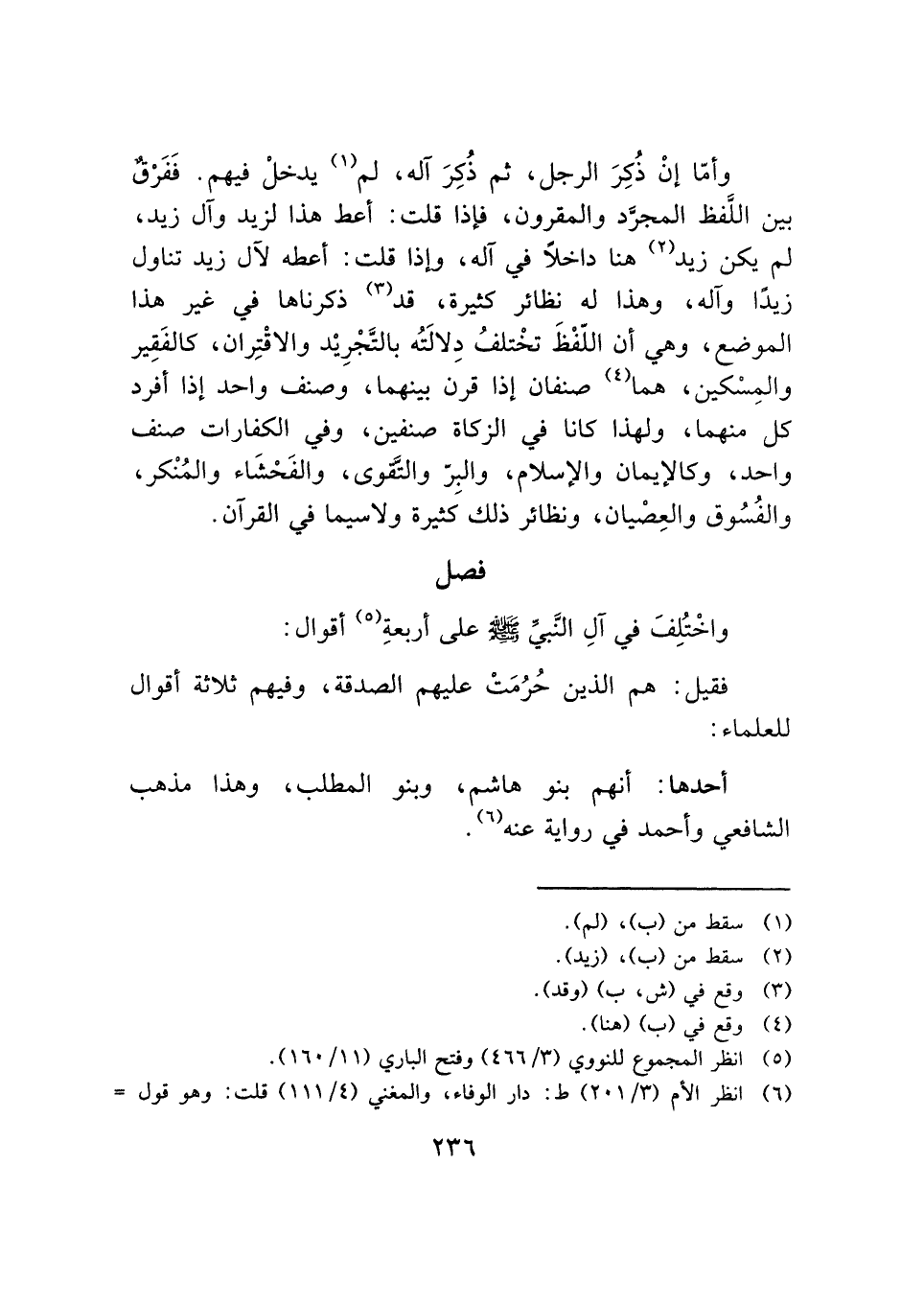 وأمّا إنْ ذُكِرَ الرجل، ثم ذُكِرَ آله، لم (¬١) يدخلْ فيهم. فَفَرْقٌ بين اللَّفظ المجرَّد والمقرون، فإذا قلت: أعط هذا لزيد وآل زيد، لم يكن زيد (¬٢) هنا داخلًا في آله، وإذا قلت: أعطه لآل زيد تناول زيدًا وآله، وهذا له نظائر كثيرة، قد (¬٣) ذكرناها في غير هذا الموضع، وهي أن اللّفْظَ تخْتلفُ دِلالَتُه بالتَّجْرِيْد والاقْتِران، كالفَقِير والمِسْكين، هما (¬٤) صنفان إذا قرن بينهما، وصنف واحد إذا أفرد كل منهما، ولهذا كانا في الزكاة صنفين، وفي الكفارات صنف واحد، وكالإيمان والإسلام، والبِرّ والتَّقوى، والفَحْشَاء والمُنْكر، والفُسُوق والعِصْيان، ونظائر ذلك كثيرة ولاسيما في القرآن.