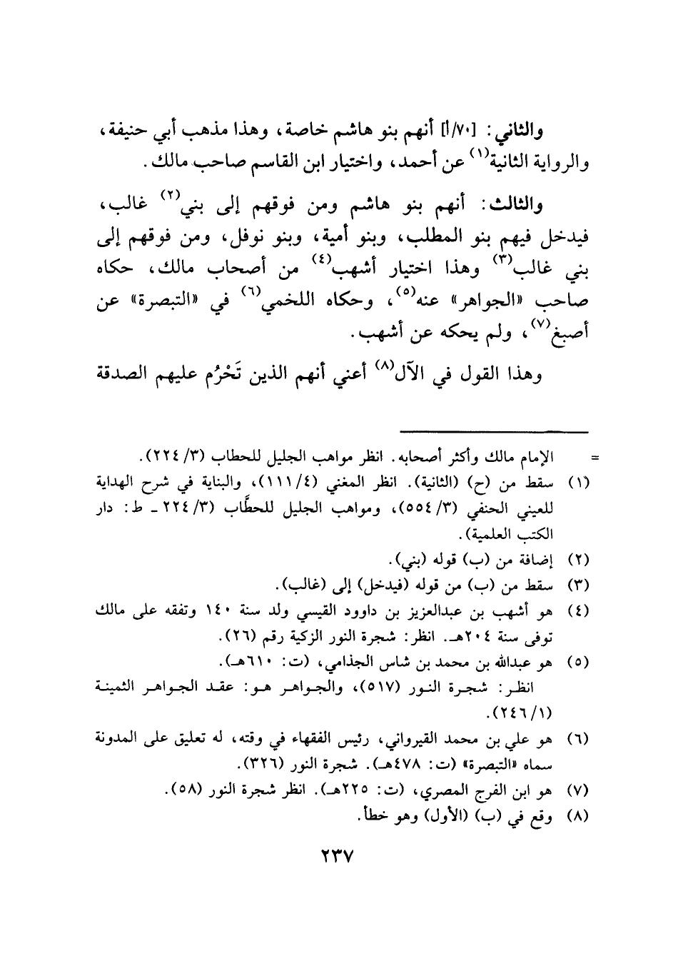 والثالث: أنهم بنو هاشم ومن فوقهم إلى بني (¬٢) غالب، فيدخل فيهم بنو المطلب، وبنو أمية، وبنو نوفل، ومن فوقهم إلى بني غالب (¬٣) وهذا اختيار أشهب (¬٤) من أصحاب مالك، حكاه صاحب "الجواهر" عنه (¬٥)، وحكاه اللخمي (¬٦) في "التبصرة" عن أصبغ (¬٧)، ولم يحكه عن أشهب.
