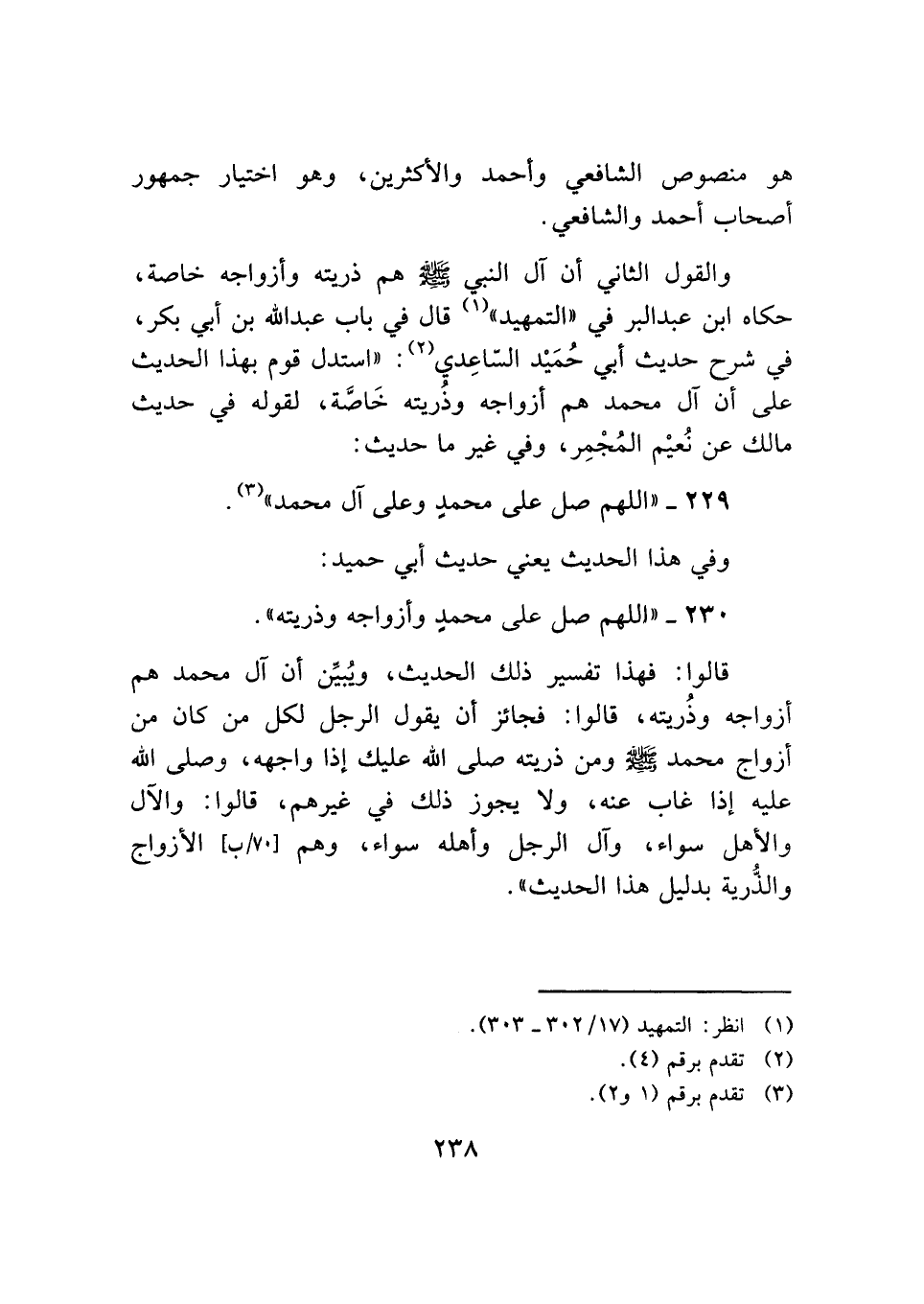 والقول الثاني أن آل النبي - صلى الله عليه وسلم - هم ذريته وأزواجه خاصة، حكاه ابن عبد البر في "التمهيد" (¬١) قال في باب عبد الله بن أبي بكر، في شرح حديث أبي حُمَيْد السّاعِدي (¬٢): "استدل قوم بهذا الحديث على أن آل محمد هم أزواجه وذُريته خَاصَّة، لقوله في حديث مالك عن نُعيْم المُجْمِر، وفي غير ما حديث: