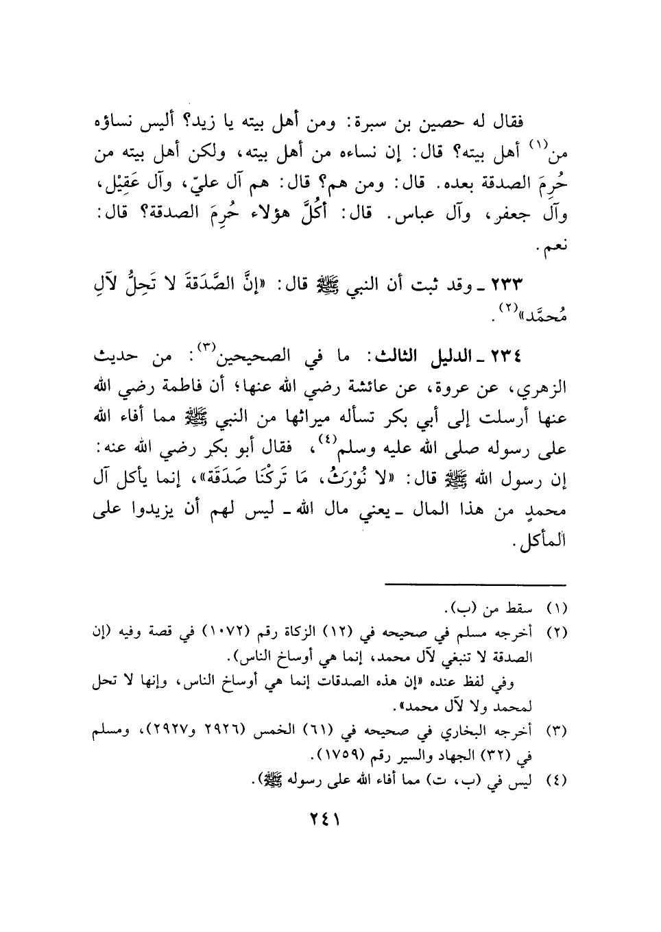 ٢٣٣ - وقد ثبت أن النبي - صلى الله عليه وسلم - قال: "إنَّ الصَّدَقةَ لا تَحِلُّ لآلِ مُحمَّد" (¬٢).