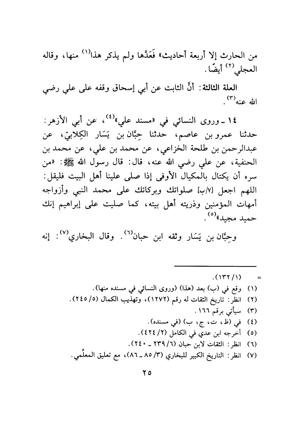 ١٤ - وروى النسائي في "مسند علي" (¬٤)، عن أبي الأزهر: حدثنا عمرو بن عاصم، حدثنا حِبَّان بن يَسَار الكِلابيّ، عن عبد الرحمن بن طلحة الخزاعي، عن محمَّد بن علي، عن محمَّد بن الحنفية، عن علي - رضي الله عنه -، قال: قال رسول الله - صلى الله عليه وسلم -: "من سره أن يكتال بالمكيال الأوفى إذا صلى علينا أهل البيت فليقل: اللهم اجعل صلواتك وبركاتك على محمَّد النبي وأزواجه أمهات المؤمنين وذريته أهل بيته، كما صليت على إبراهيم إنك حميد مجيد" (¬٥).