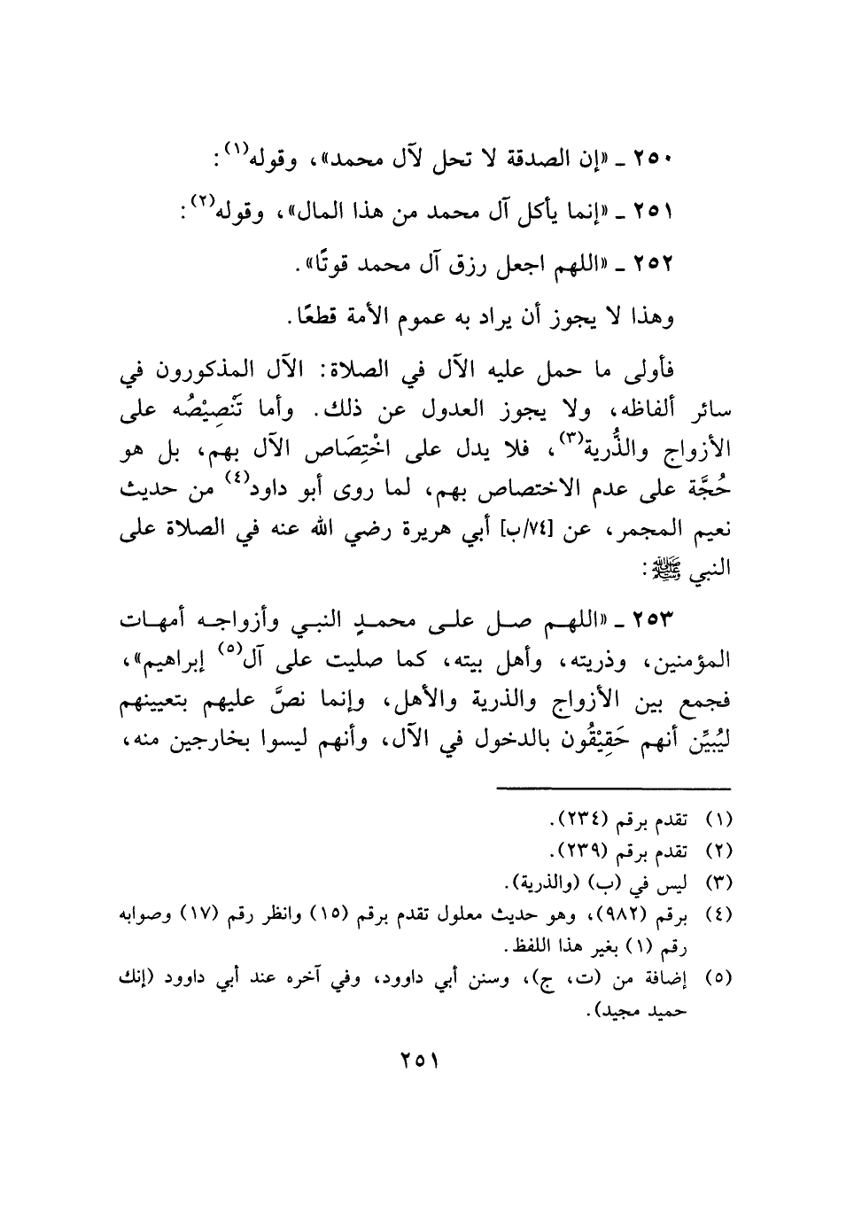 ٢٥٣ - "اللهم صل على محمدٍ النبي وأزواجه أمهات المؤمنين، وذريته، وأهل بيته، كما صليت على آل (¬٥) إبراهيم"، فجمع بين الأزواج والذرية والأهل، وإنما نصَّ عليهم بتعيينهم ليُبيِّن أنهم حَقِيْقُون بالدخول في الآل، وأنهم ليسوا بخارجين منه،