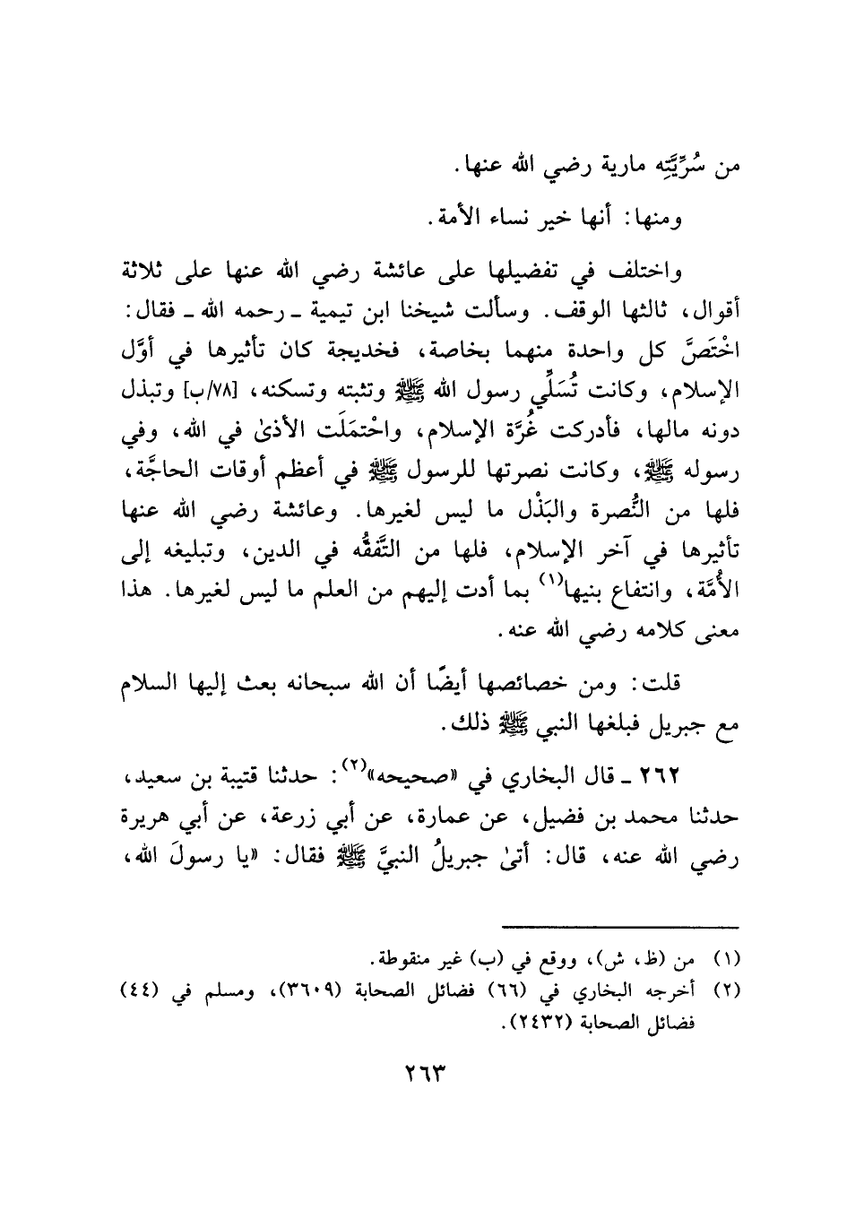 واختلف في تفضيلها على عائشة رضي الله عنها على ثلاثة أقوال، ثالثها الوقف. وسألت شيخنا ابن تيمية -رحمه الله- فقال: اخْتَصَّ كل واحدة منهما بخاصة، فخديجة كان تأثيرها في أوَّل الإسلام، وكانت تُسَلِّي رسول الله - صلى الله عليه وسلم - وتثبته وتسكنه، وتبذل دونه مالها، فأدركت غُرَّة الإسلام، واحْتمَلَت الأذى في الله، وفي رسوله - صلى الله عليه وسلم -، وكانت نصرتها للرسول - صلى الله عليه وسلم - في أعظم أوقات الحاجَّة، فلها من النُّصرة والبَذْل ما ليس لغيرها. وعائشة رضي الله عنها تأثيرها في آخر الإسلام، فلها من التَّفقُّه في الدين، وتبليغه إلى الأُمَّة، وانتفاع بنيها (¬١) بما أدت إليهم من العلم ما ليس لغيرها. هذا معنى كلامه رضي الله عنه.