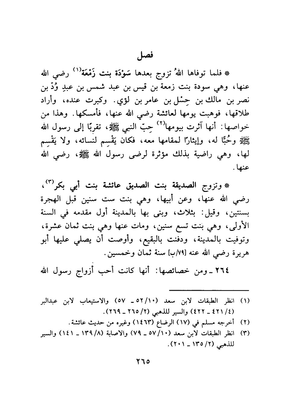* فلما توفاها اللهُ تزوج بعدها سَوْدَة بنت زَمْعَة (¬١) رضي الله عنها، وهي سودة بنت زمعة بن قيس بن عبد شمس بن عبدِ وُدّ بن نصر بن مالك بن حِسْل بن عامر بن لؤي. وكبرت عنده، وأراد طلاقها، فوهبت يومها لعائشة رضي الله عنها، فأمسكها. وهذا من خواصها: أنها آثرت بيومها (¬٢) حِبّ النبي - صلى الله عليه وسلم -، تقربًا إلى رسول الله - صلى الله عليه وسلم - وحُبًّا له، وإيثارًا لمقامها معه، فكان يَقْسِم لنسائه، ولا يَقْسِم لها، وهي راضية بذلك مؤثرة لرضى رسول الله - صلى الله عليه وسلم -، رضي الله عنها.