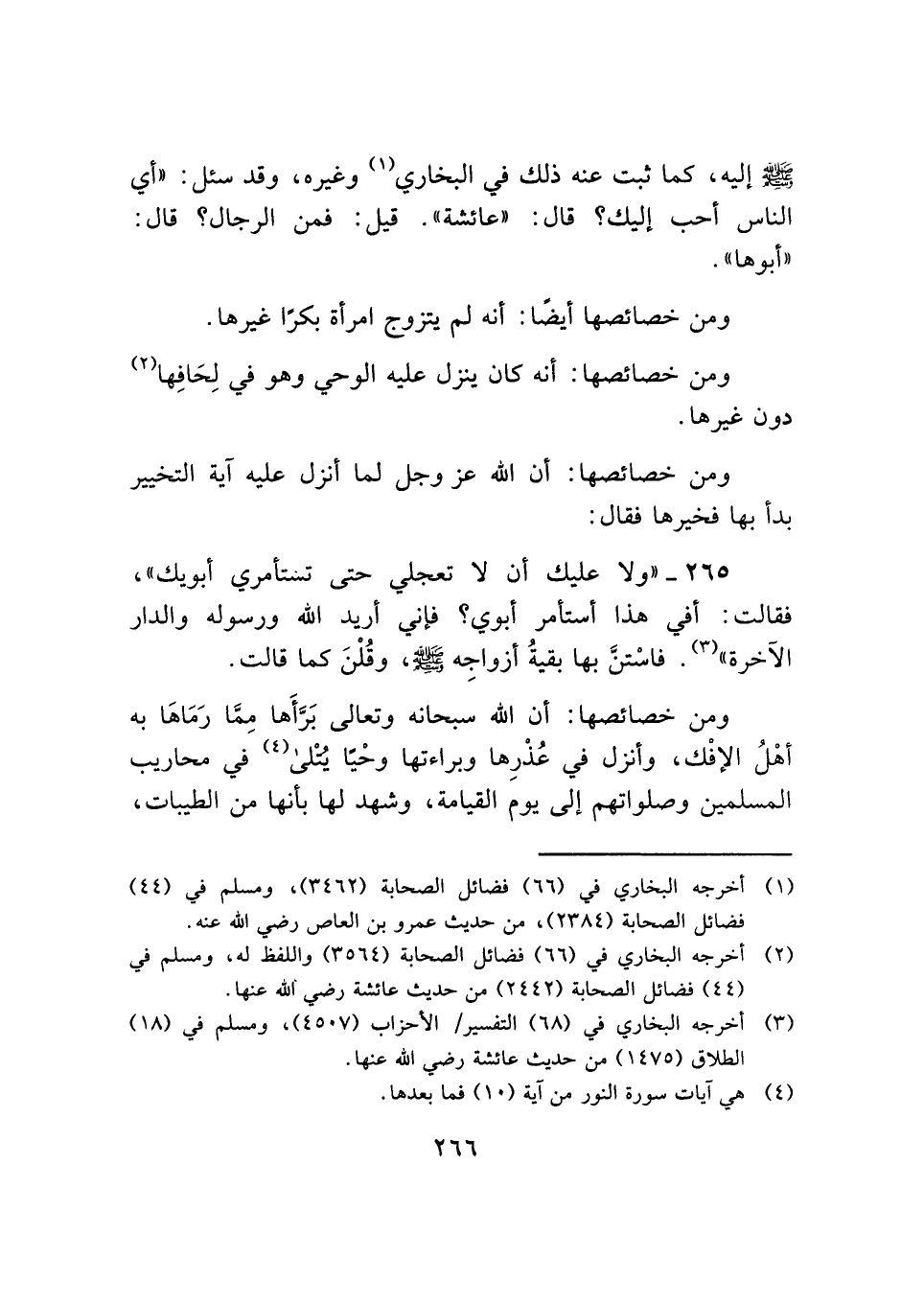 ٢٦٥ - "ولا عليك أن لا تعجلي حتى تستأمري أبويك"، فقالت: أفي هذا أستأمر أبوي؟ فإني أريد الله ورسوله والدار الآخرة" (¬٣). فاسْتنَّ بها بقيةُ أزواجِه - صلى الله عليه وسلم -، وقُلْنَ كما قالت.