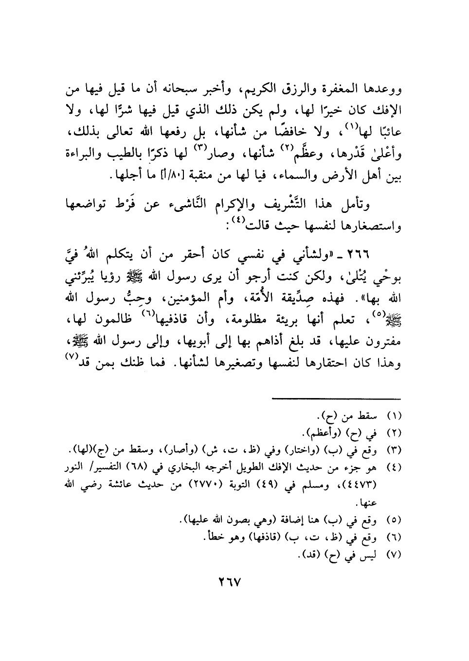 ٢٦٦ - "ولشأني في نفسي كان أحقر من أن يتكلم اللهُ فيَّ بوحْي يُتْلى، ولكن كنت أرجو أن يرى رسول الله - صلى الله عليه وسلم - رؤيا يُبرِّئني الله بها". فهذه صِدِّيقة الأُمّة، وأم المؤمنين، وحبُّ رسول الله - صلى الله عليه وسلم - (¬٥)، تعلم أنها بريئة مظلومة، وأن قاذفيها (¬٦) ظالمون لها، مفترون عليها، قد بلغ أذاهم بها إلى أبويها، وإلى رسول الله - صلى الله عليه وسلم -، وهذا كان احتقارها لنفسها وتصغيرها لشأنها. فما ظنك بمن قد (¬٧)