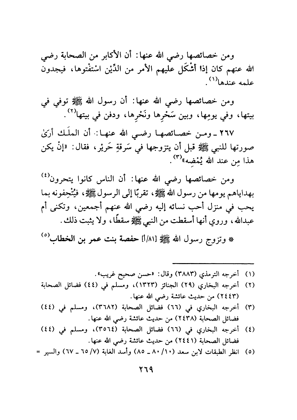 ومن خصائصها رضي الله عنها: أن الناس كانوا يتحرون (¬٤) بهداياهم يومها من رسول الله - صلى الله عليه وسلم -، تقربًا إلى الرسول - صلى الله عليه وسلم -، فيُتْحِفونه بما يحب في منزل أحب نسائه إليه رضي الله عنهم أجمعين، وتكنى أم عبد الله، وروي أنها أسقطت من النبي - صلى الله عليه وسلم - سقطًا، ولا يثبت ذلك.