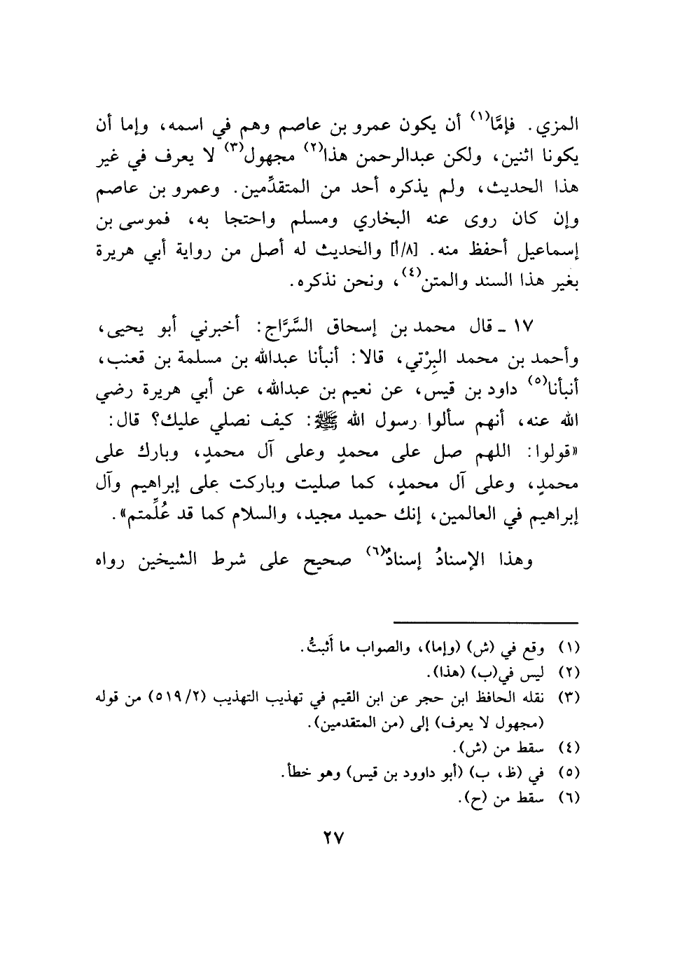 ١٧ - قال محمَّد بن إسحاق السَّرَّاج: أخبرني أبو يحيى، وأحمد بن محمَّد البِرْتي، قالا: أنبأنا عبد الله بن مسلمة بن قعنب، أنبأنا (¬٥) داود بن قيس، عن نعيم بن عبد الله، عن أبي هريرة - رضي الله عنه -، أنهم سألوا رسول الله - صلى الله عليه وسلم -: كيف نصلي عليك؟ قال: "قولوا: اللهم صل على محمدٍ وعلى آل محمدٍ، وبارك على محمدٍ، وعلى آل محمدٍ، كما صليت وباركت على إبراهيم وآل إبراهيم في العالمين، إنك حميد مجيد، والسلام كما قد عُلِّمتم".