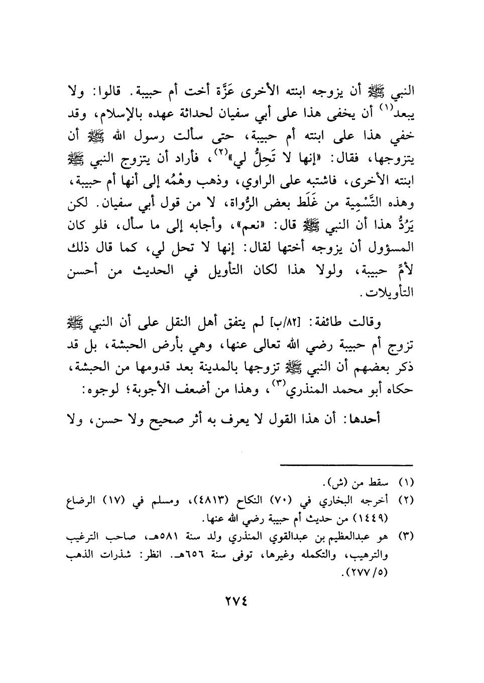 وقالت طائفة: لم يتفق أهل النقل على أن النبي - صلى الله عليه وسلم - تزوج أم حبيبة رضي الله تعالى عنها، وهي بأرض الحبشة، بل قد ذكر بعضهم أن النبي - صلى الله عليه وسلم - تزوجها بالمدينة بعد قدومها من الحبشة، حكاه أبو محمد المنذري (¬٣)، وهذا من أضعف الأجوبة؛ لوجوه: