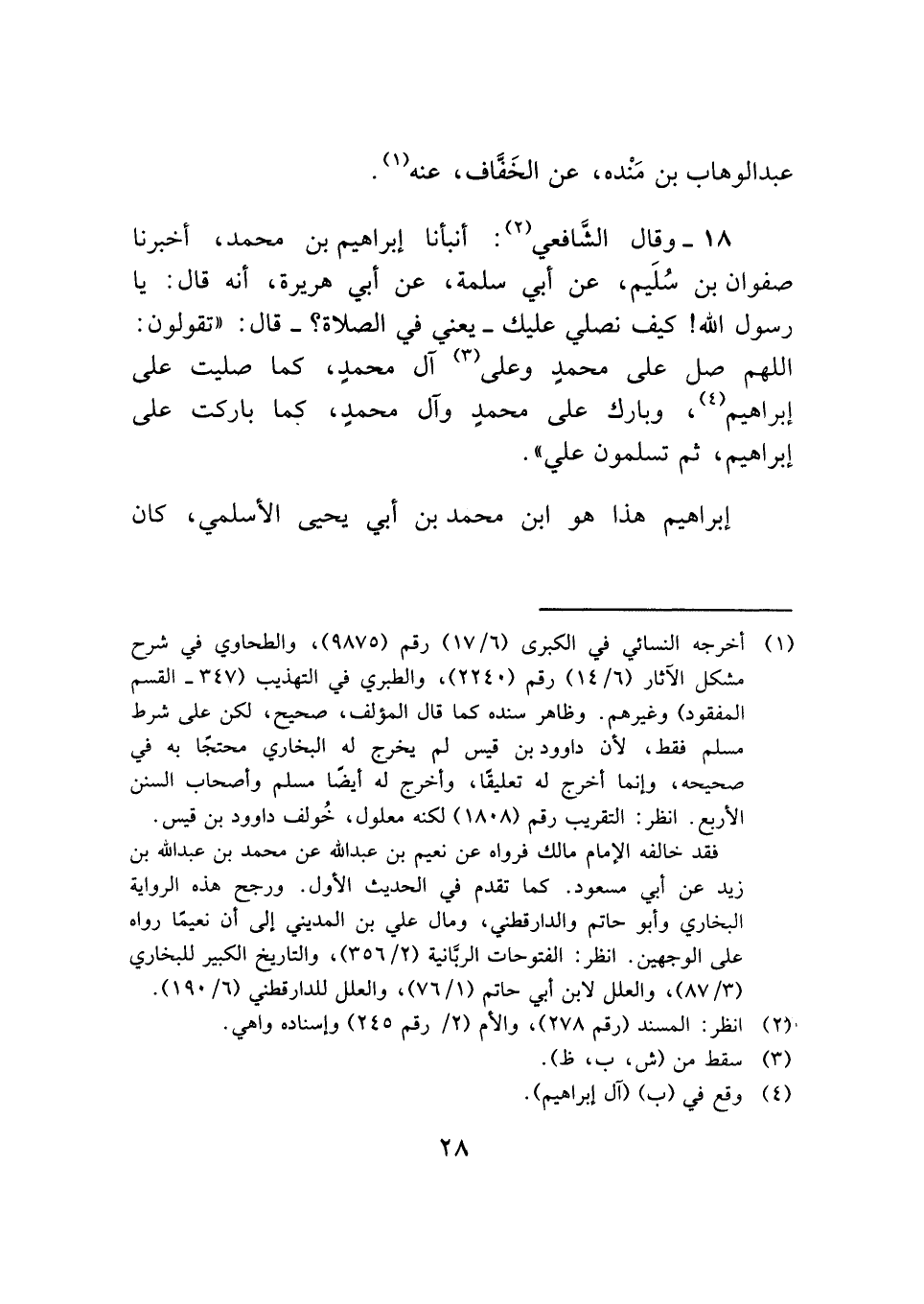 ١٨ - وقال الشَّافعي (¬٢): أنبأنا إبراهيم بن محمَّد، أخبرنا صفوان بن سُلَيم، عن أبي سلمة، عن أبي هريرة، أنَّه قال: يا رسول الله! كيف نصلي عليك - يعني في الصلاة؟ - قال: "تقولون: اللهم صل على محمدٍ وعلى (¬٣) آل محمدٍ، كما صليت على إبراهيم (¬٤)، وبارك على محمَّدٍ وآل محمدٍ، كما باركت على إبراهيم، ثمَّ تسلمون علي".