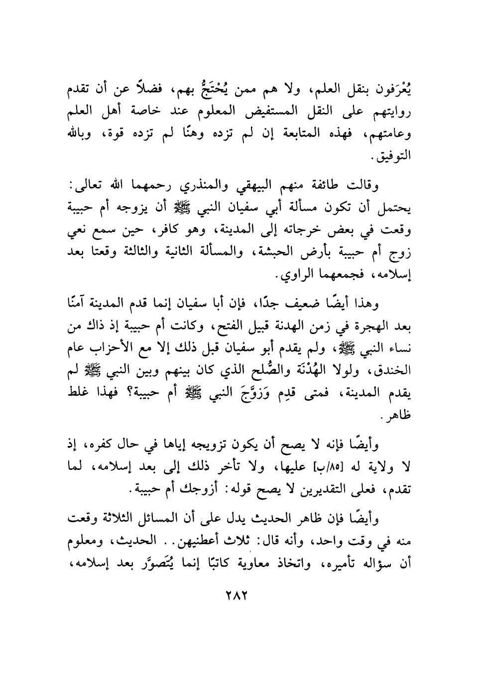 وهذا أيضًا ضعيف جدًا، فإن أبا سفيان إنما قدم المدينة آمنًا بعد الهجرة في زمن الهدنة قبيل الفتح، وكانت أم حبيبة إذ ذاك من نساء النبي - صلى الله عليه وسلم -، ولم يقدم أبو سفيان قبل ذلك إلا مع الأحزاب عام الخندق، ولولا الهُدْنَة والصُّلح الذي كان بينهم وبين النبي - صلى الله عليه وسلم - لم يقدم المدينة، فمتى قدِم وَزوَّجَ النبي - صلى الله عليه وسلم - أم حبيبة؟ فهذا غلط ظاهر.