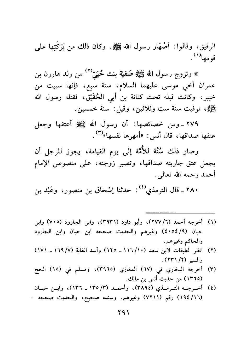 ٢٧٩ - ومن خصائصها: أن رسول الله - صلى الله عليه وسلم - أعتقها وجعل عتقها صداقها، قال أنس: "أمهرها نفسها" (¬٣).