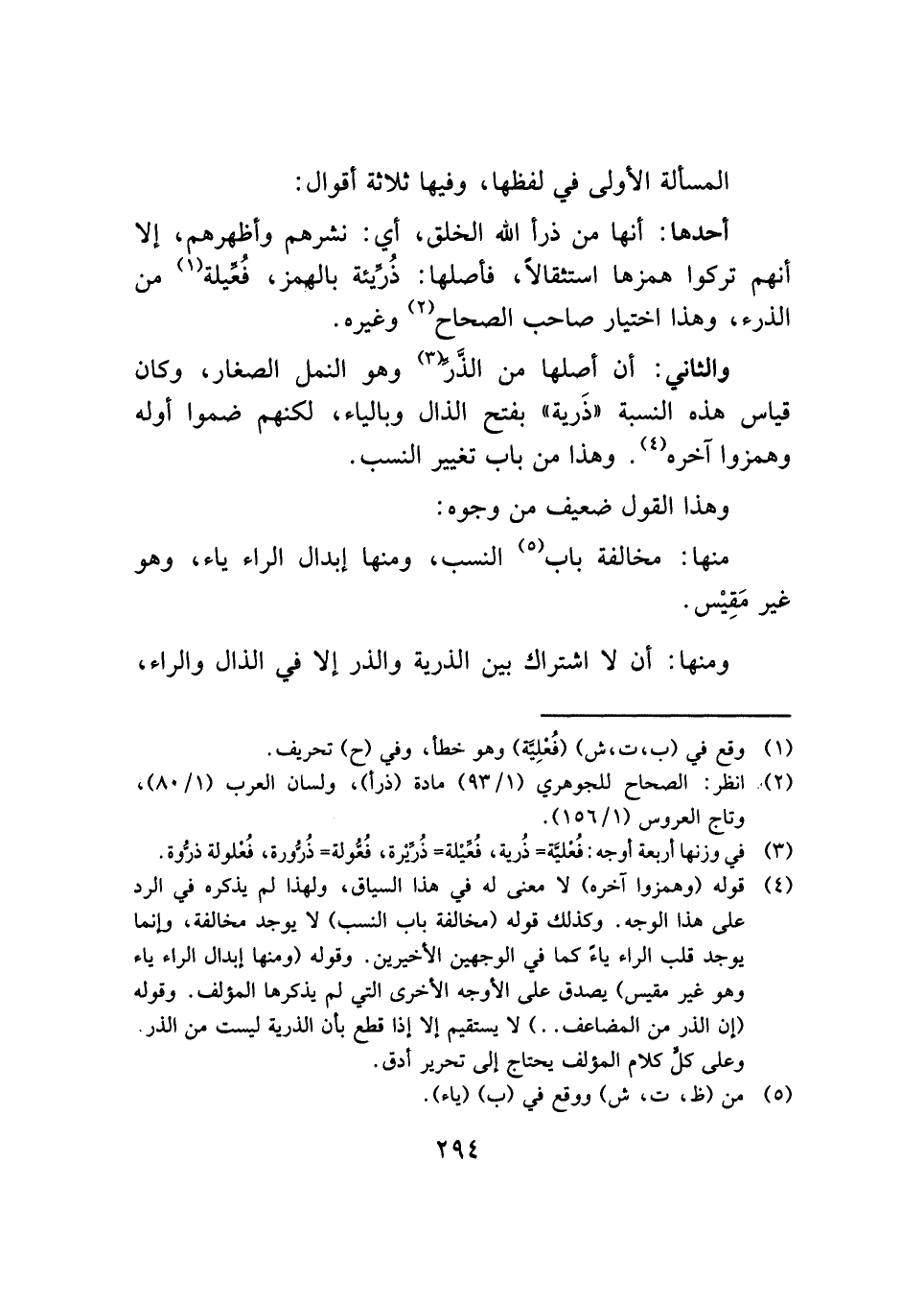 (¬٤) قوله (وهمزوا آخره) لا معنى له في هذا السياق، ولهذا لم يذكره في الرد على هذا الوجه. وكذلك قوله (مخالفة باب النسب) لا يوجد مخالفة، وإنما يوجد قلب الراء ياءً كما في الوجهين الأخيرين. وقوله (ومنها إبدال الراء ياء وهو غير مقيس) يصدق على الأوجه الأخرى التي لم يذكرها المؤلف. وقوله (إن الذر من المضاعف .. ) لا يستقيم إلا إذا قطع بأن الذرية لست من الذر وعلى كلٍّ كلام المؤلف يحتاج إلى تحرير أدق.