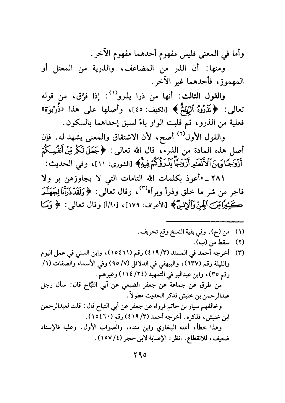 ٢٨١ - "أعوذ بكلمات الله التامات التي لا يجاوزهن بر ولا فاجر من شر ما خلق وذرأ وبرأ" (¬٣)، وقال تعالى: {وَلَقَدْ ذَرَأْنَا لِجَهَنَّمَ كَثِيرًا مِنَ الْجِنِّ وَالْإِنْسِ} [الأعراف: ١٧٩]، وقال تعالى: {وَمَا