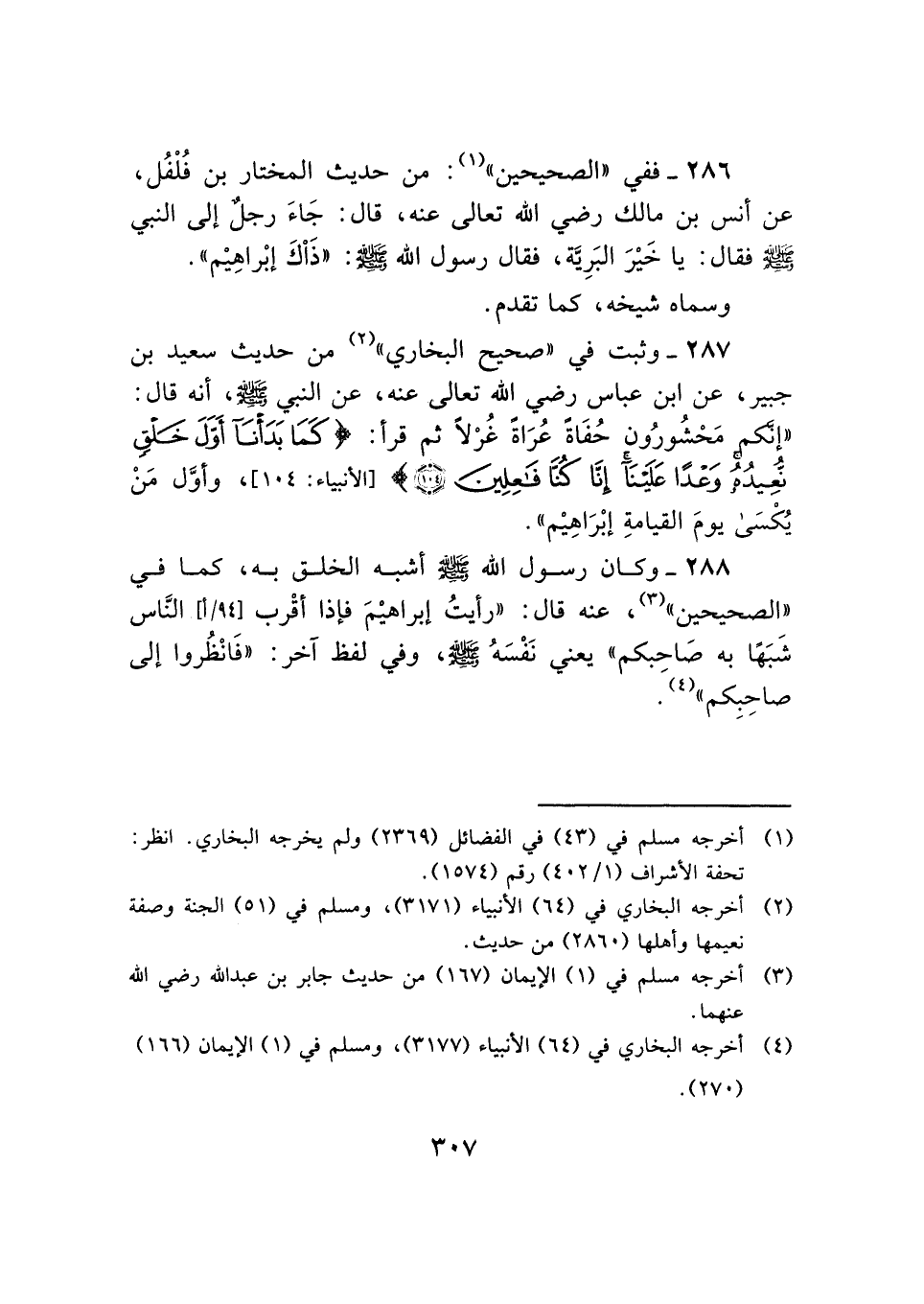 ٢٨٦ - ففي "الصحيحين" (¬١): من حديث المختار بن فُلْفُل، عن أنس بن مالك رضي الله تعالى عنه، قال: جَاءَ رجل إلى النبي - صلى الله عليه وسلم - فقال: يا خَيْرَ البَرِيَّة، فقال رسول الله - صلى الله عليه وسلم -: "ذَاْكَ إبْراهِيْم".