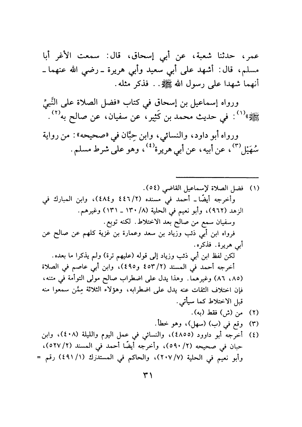 ورواه إسماعيل بن إسحاق في كتاب "فضل الصلاة على النَّبيِّ - صلى الله عليه وسلم -" (¬١): في حديث محمَّد بن كَثِير، عن سفيان، عن صالح به (¬٢).