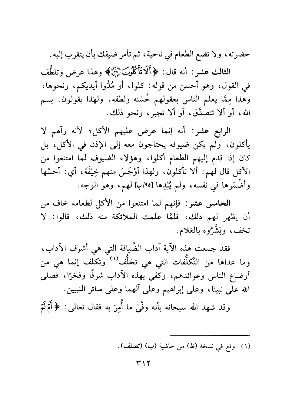فقد جمعت هذه الآية آداب الضِّيافة التي هي أشرف الآداب، وما عداها من التكلُّفات التي هي تخلُّف (¬١) وتكلف إنما هي من أوضاع الناس وعوائدهم، وكفى بهذه الآداب شرفًا وفخرًا، فصلى الله على نبينا، وعلى إبراهيم وعلى آلهما وعلى سائر النبيين.