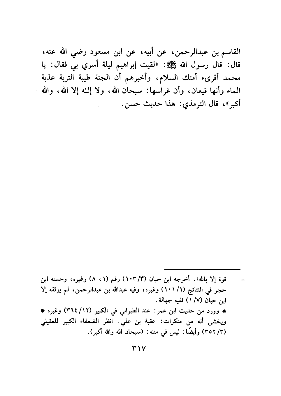 القاسم بن عبد الرحمن، عن أبيه، عن ابن مسعود رضي الله عنه، قال: قال رسول الله - صلى الله عليه وسلم -: "لقيت إبراهيم ليلة أسري بي فقال: يا محمد أقرئ أمتك السلام، وأخبرهم أن الجنة طيبة التربة عذبة الماء وأنها قيعان، وأن غراسها: سبحان الله، ولا إله إلا الله، والله أكبر"، قال الترمذي: هذا حديث حسن.