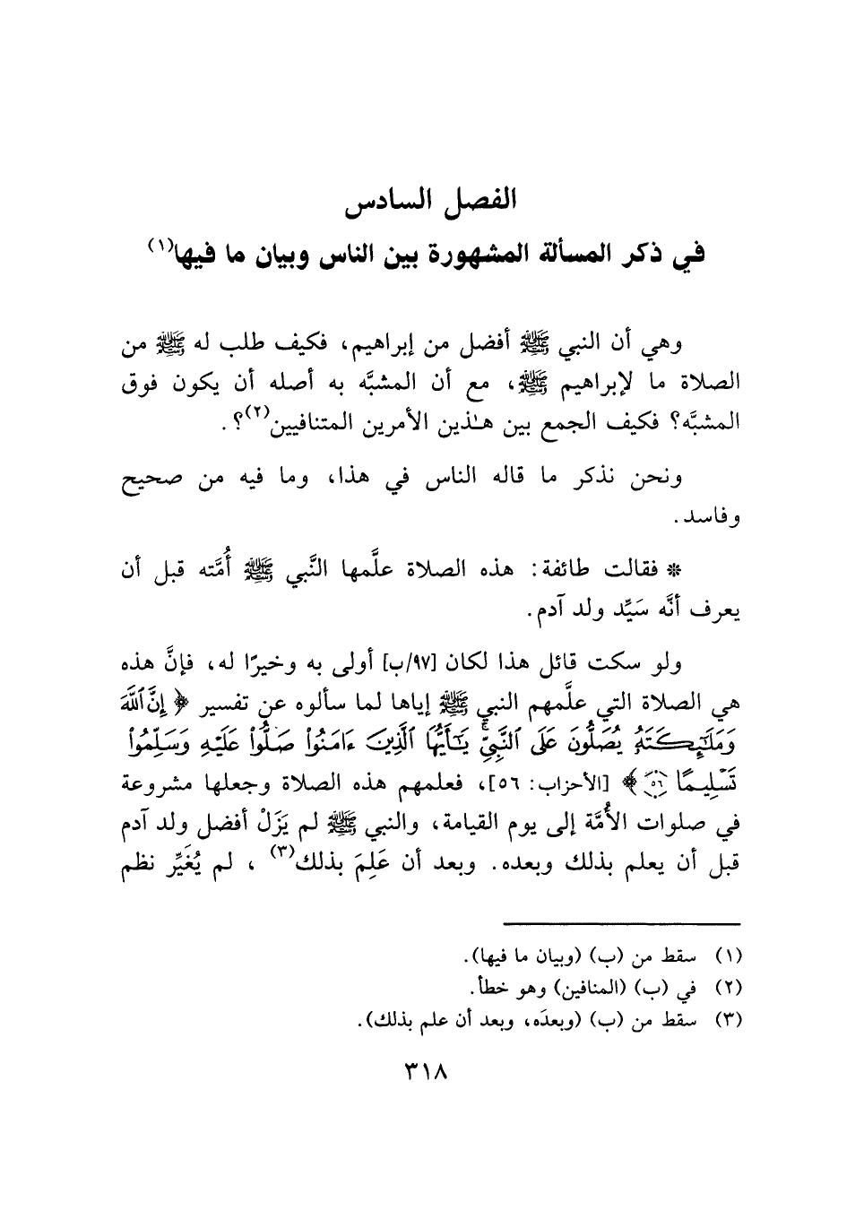 وهي أن النبي - صلى الله عليه وسلم - أفضل من إبراهيم، فكيف طلب له - صلى الله عليه وسلم - من الصلاة ما لإبراهيم - صلى الله عليه وسلم -، مع أن المشبَّه به أصله أن يكون فوق المشبَّه؟ فكيف الجمع بين هذين الأمرين المتنافيين (¬٢)؟.