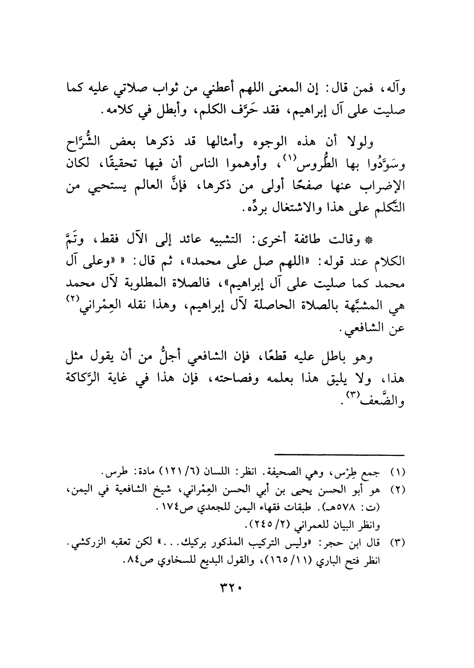 * وقالت طائفة أخرى: التشبيه عائد إلى الآل فقط، وتَمَّ الكلام عند قوله: "اللهم صل على محمد"، ثم قال: ""وعلى آل محمد كما صليت على آل إبراهيم"، فالصلاة المطلوبة لآل محمد هي المشبَّهة بالصلاة الحاصلة لآل إبراهيم، وهذا نقله العِمْراني (¬٢) عن الشافعي.