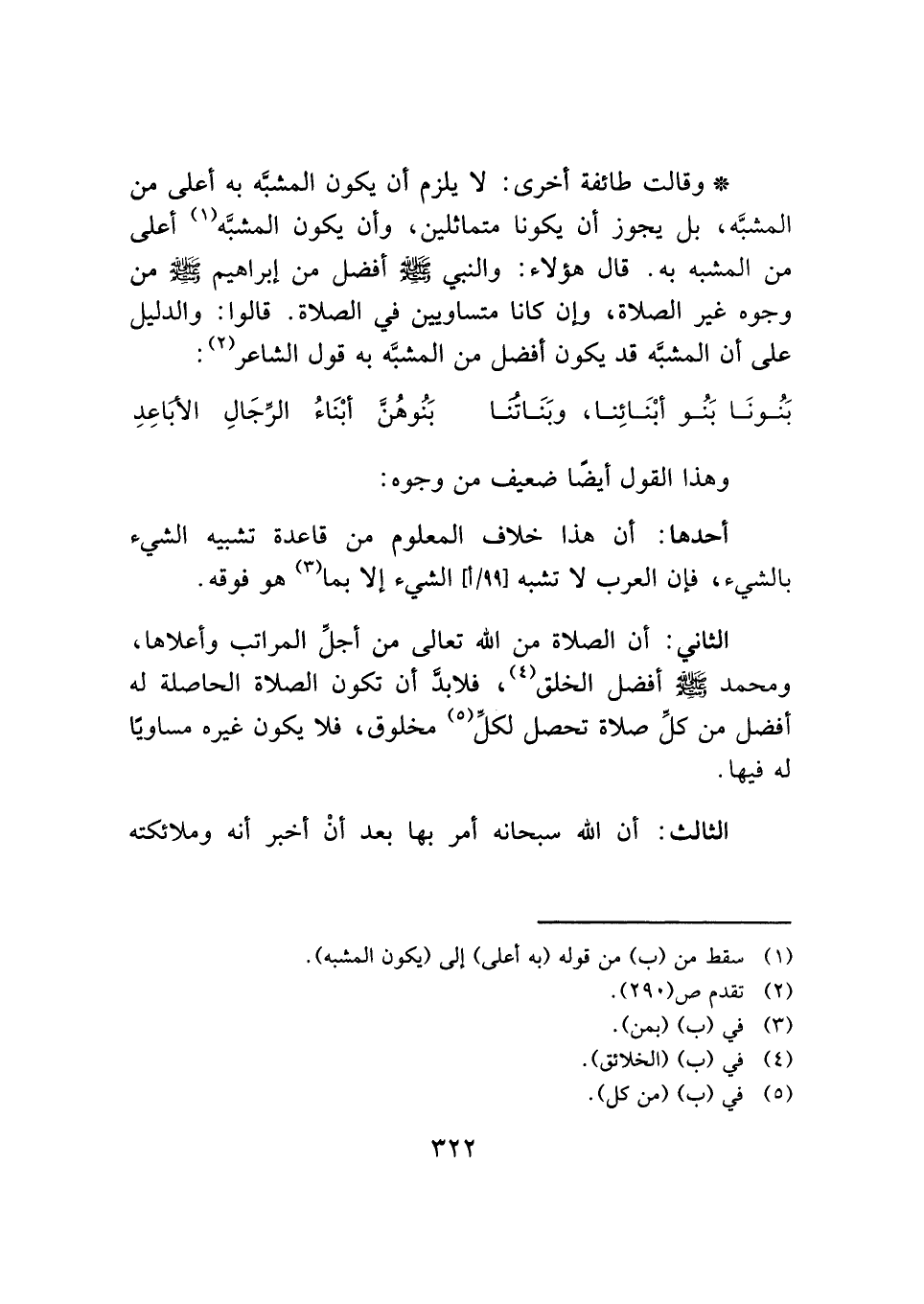 * وقالت طائفة أخرى: لا يلزم أن يكون المشبَّه به أعلى من المشبَّه، بل يجوز أن يكونا متماثلين، وأن يكون المشبَّه (¬١) أعلى من المشبه به. قال هؤلاء: والنبي - صلى الله عليه وسلم - أفضل من إبراهيم - صلى الله عليه وسلم - من وجوه غير الصلاة، وإن كانا متساويين في الصلاة. قالوا: والدليل على أن المشبَّه قد يكون أفضل من المشبَّه به قول الشاعر (¬٢):