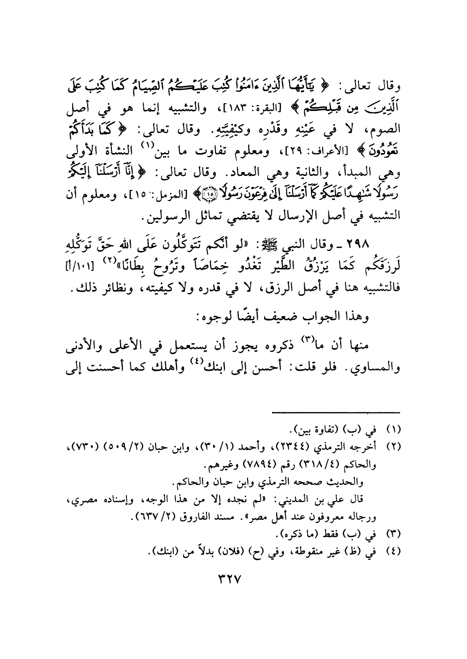 ٢٩٨ - وقال النبي - صلى الله عليه وسلم -: "لو أنكم تَتَوكَّلُون عَلَى اللهِ حَقَّ تَوَكُّلِهِ لَرزَقكُم كَمَا يَرْزُقُ الطَّيْر تَغْدُو خِمَاصًا وتَرُوحُ بطَانًا" (¬٢) فالتشبيه هنا في أصل الرزق، لا في قدره ولا كيفيته، ونظائر ذلك.