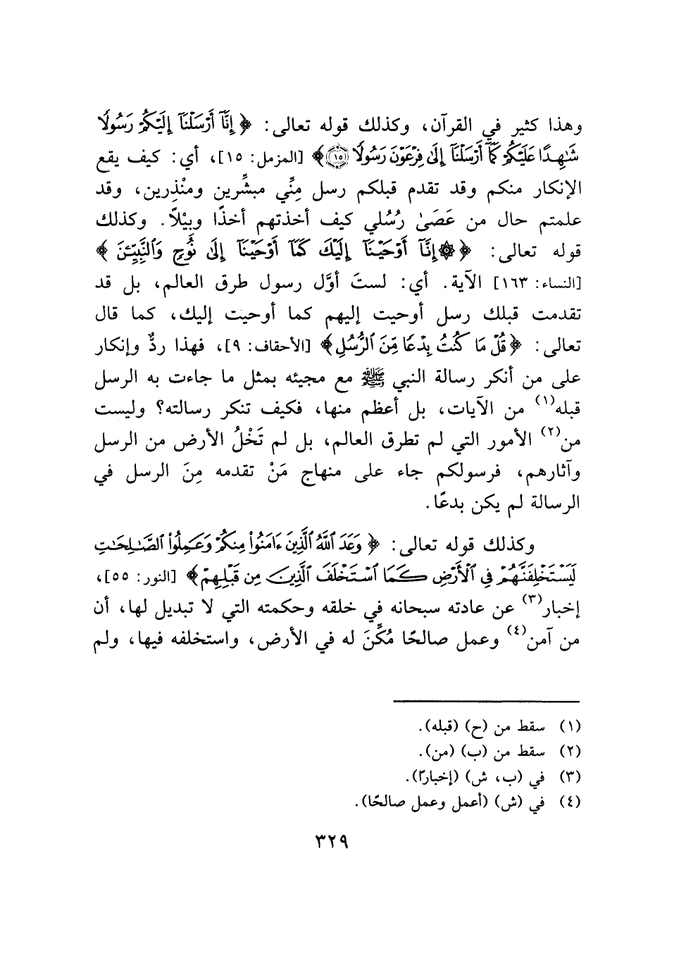 وهذا كثير في القرآن، وكذلك قوله تعالى: {إِنَّا أَرْسَلْنَا إِلَيْكُمْ رَسُولًا شَاهِدًا عَلَيْكُمْ كَمَا أَرْسَلْنَا إِلَى فِرْعَوْنَ رَسُولًا (١٥)} [المزمل: ١٥]، أي: كيف يقع الإنكار منكم وقد تقدم قبلكم رسل مِنِّي مبشِّرين ومنْذِرين، وقد علمتم حال من عَصَى رُسُلي كيف أخذتهم أخذا وبِيْلًا. وكذلك قوله تعالى: {إِنَّا أَوْحَيْنَا إِلَيْكَ كَمَا أَوْحَيْنَا إِلَى نُوحٍ وَالنَّبِيِّينَ} [النساء: ١٦٣] الآية. أي: لستَ أوَّل رسول طرق العالم، بل قد تقدمت قبلك رسل أوحيت إليهم كما أوحيت إليك، كما قال تعالى: {قُلْ مَا كُنْتُ بِدْعًا مِنَ الرُّسُلِ} [الأحقاف: ٩]، فهذا ردٌّ وإنكار على من أنكر رسالة النبي - صلى الله عليه وسلم - مع مجيئه بمثل ما جاءت به الرسل قبله (¬١) من الآيات، بل أعظم منها، فكيف تنكر رسالته؟ وليست من (¬٢) الأمور التي لم تطرق العالم، بل لم تَخْلُ الأرض من الرسل وآثارهم، فرسولكم جاء على منهاج مَنْ تقدمه مِنَ الرسل في الرسالة لم يكن بدعًا.