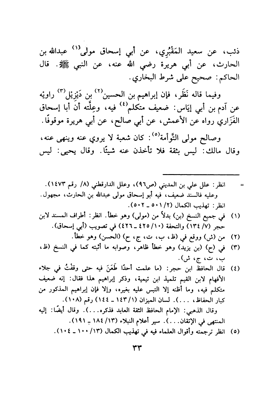 (¬٤) قال الحافظ ابن حجر: (ما علمت أحدًا طَعَنَ فيه حتى وقفْتُ في جلاء الأفهام لابن القيم تلميذ ابن تيمية، وذكر إبراهيم هذا فقال: إنه ضعيف متكلم فيه، وما أظنه إلا التبس عليه بغيره، وإلا فإن إبراهيم المذكور من كبار الحفاظ،. . .). لسان الميزان (١/ ١٤٣ - ١٤٤) رقم (١٠٨).