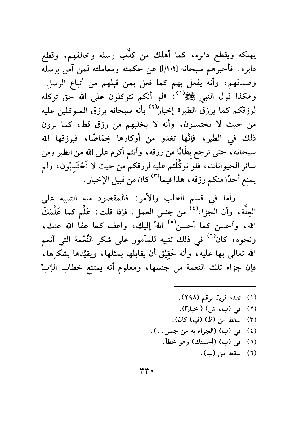 يهلكه ويقطع دابره، كما أهلك من كذَّب رسله وخالفهم، وقطع دابره. فأخبرهم سبحانه عن حكمته ومعاملته لمن آمن برسله وصدقهم، وأنه يفعل بهم كما فعل بمن قبلهم من أتباع الرسل. وهكذا قول النبي - صلى الله عليه وسلم - (¬١): "لو أنكم تتوكلون على الله حق توكله لرزقكم كما يرزق الطير" إخبارٌ (¬٢) بأنه سبحانه يرزق المتوكلين عليه من حيث لا يحتسبون، وأنه لا يخليهم من رزق قط، كما ترون ذلك في الطير، فإنَّها تغدو من أوكارها خِمَاصًا، فيرزقها الله سبحانه، حتى ترجع بطَانًا من رزقه، وأنتم أكرم على الله من الطير ومن سائر الحيوانات، فلوَ توكَّلْتم عليه لرزقكم من حيث لا تَحْتَسِبُون، ولم يمنع أحدًا منكم رزقه، هذا فيما (¬٣) كان من قبيل الإخبار.