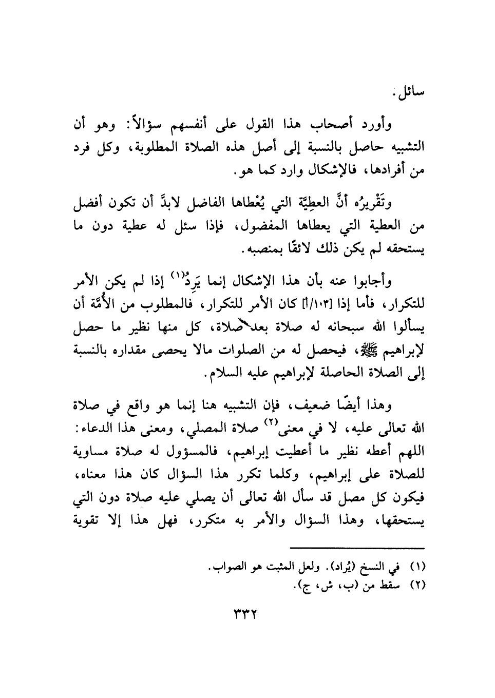 وهذا أيضًا ضعيف، فإن التشبيه هنا إنما هو واقع في صلاة الله تعالى عليه، لا في معنى (¬٢) صلاة- المصلي، ومعنى هذا الدعاء: اللهم أعطه نظير ما أعطيت إبراهيم، فالمسؤول له صلاة مساوية للصلاة على إبراهيم، وكلما تكرر هذا السؤال كان هذا معناه، فيكون كل مصل قد سأل الله تعالى أن يصلي عليه صلاة دون التي يستحقها، وهذا السؤال والأمر به متكرر، فهل هذا إلا تقوية لجانب الإشكال؟.