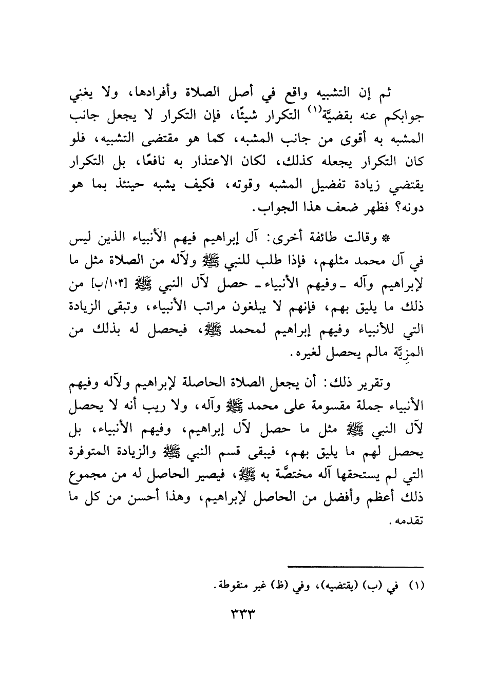 * وقالت طائفة أخرى: آل إبراهيم فيهم الأنبياء الذين ليس في آل محمد مثلهم، فإذا طلب للنبي - صلى الله عليه وسلم - ولآله من الصلاة مثل ما لإبراهيم وآله- وفيهم الأنبياء- حصل لآل النبي - صلى الله عليه وسلم - من ذلك ما يليق بهم، فإنهم لا يبلغون مراتب الأنبياء، وتبقى الزيادة التي للأنبياء وفيهم إبراهيم لمحمد - صلى الله عليه وسلم -، فيحصل له بذلك من المزِيَّة ما لم يحصل لغيره.