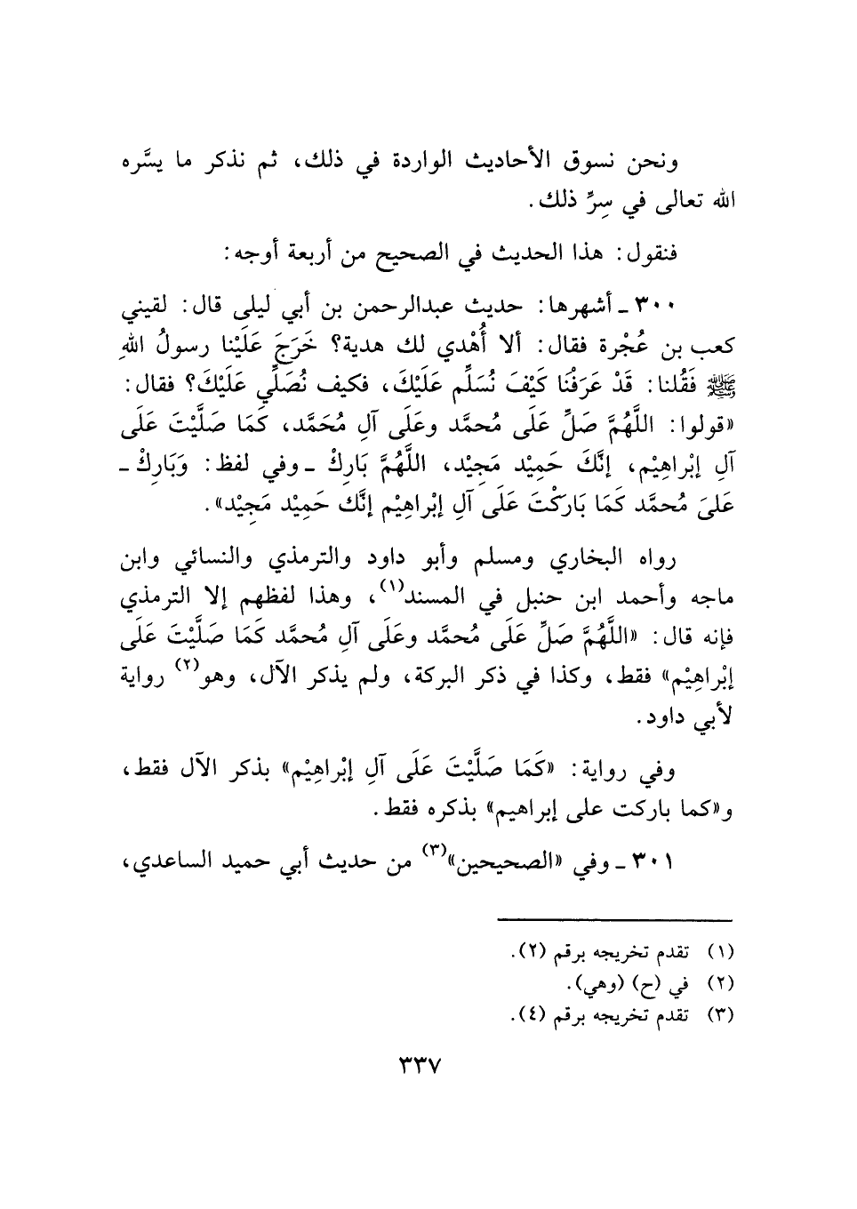 ٣٠٠ - أشهرها: حديث عبد الرحمن بن أبي ليلى قال: لقيني كعب بن عُجْرة فقال: ألا أُهْدي لك هدية؟ خَرَجَ عَلَيْنا رسولُ اللهِ - صلى الله عليه وسلم - فَقُلنا: قَدْ عَرَفْنَا كَيْفَ نُسَلِّم عَلَيْكَ، فكيف نُصَلِّي عَلَيْكَ؟ فقال: "قولوا: اللَّهُمَّ صَلِّ عَلَى مُحمَّد وعَلَى آلِ مُحَمَّد، كَمَا صَلَّيْتَ عَلَى آلِ إبْراهِيْم، إنَّكَ حَمِيْد مَجيْد، اللَّهُمَّ بَاركْ -وفي لفظ: وَبَارِكْ- عَلىَ مُحمَّد كَمَا بَاركْتَ عَلَىَ آلِ إبْراهِيْم إنَّكَ حَمِيْد مَجِيْد".