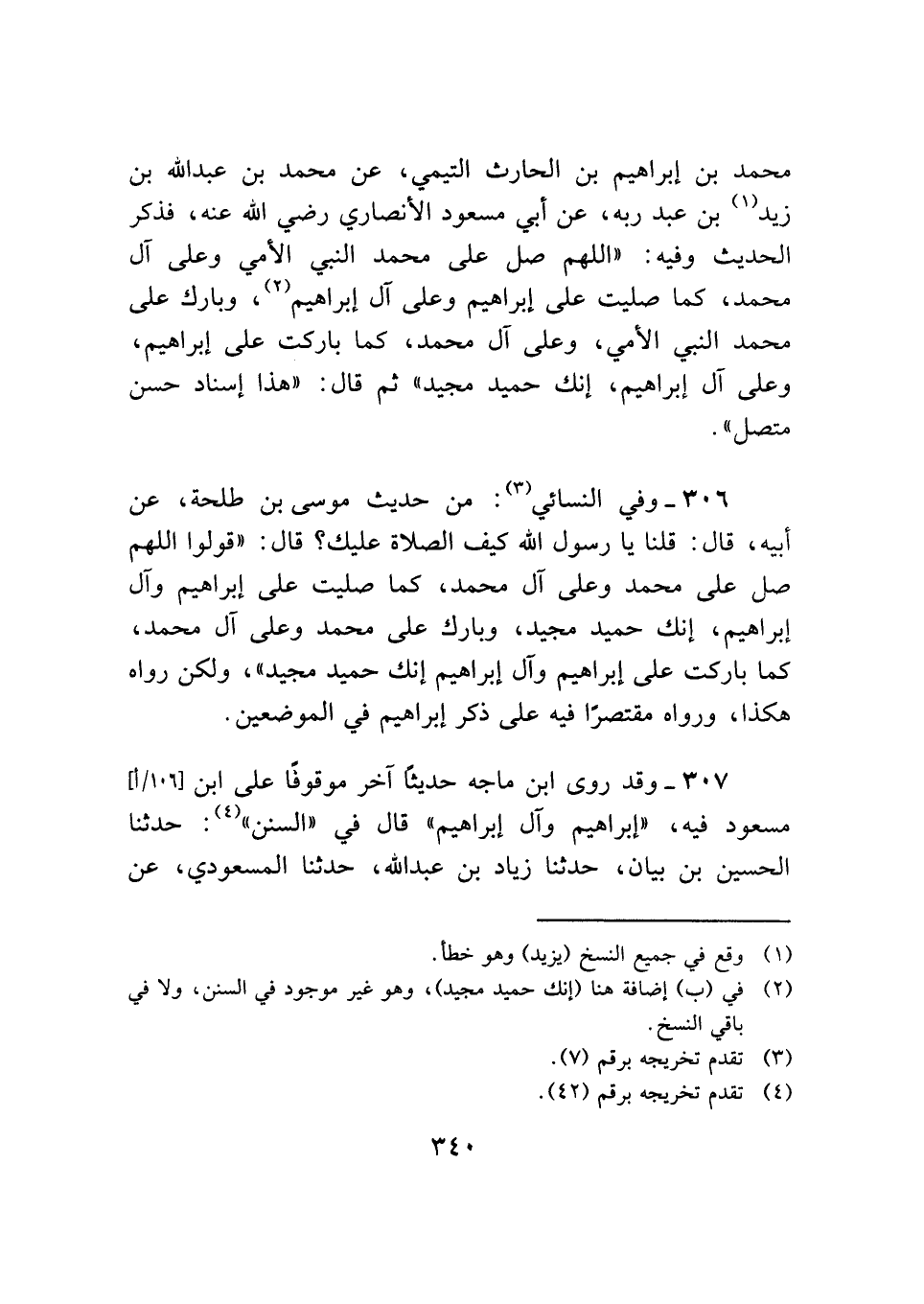 ٣٠٦ - وفي النسائي (¬٣): من حديث موسى بن طلحة، عن أبيه، قال: قلنا يا رسول الله كيف الصلاة عليك؟ قال: "قولوا اللهم صل على محمد وعلى آل محمد، كما صليت على إبراهيم وآل إبراهيم، إنك حميد مجيد، وبارك على محمد وعلى آل محمد، كما باركت على إبراهيم وآل إبراهيم إنك حميد مجيد"، ولكن رواه هكذا، ورواه مقتصرًا فيه على ذكر إبراهيم في الموضعين.