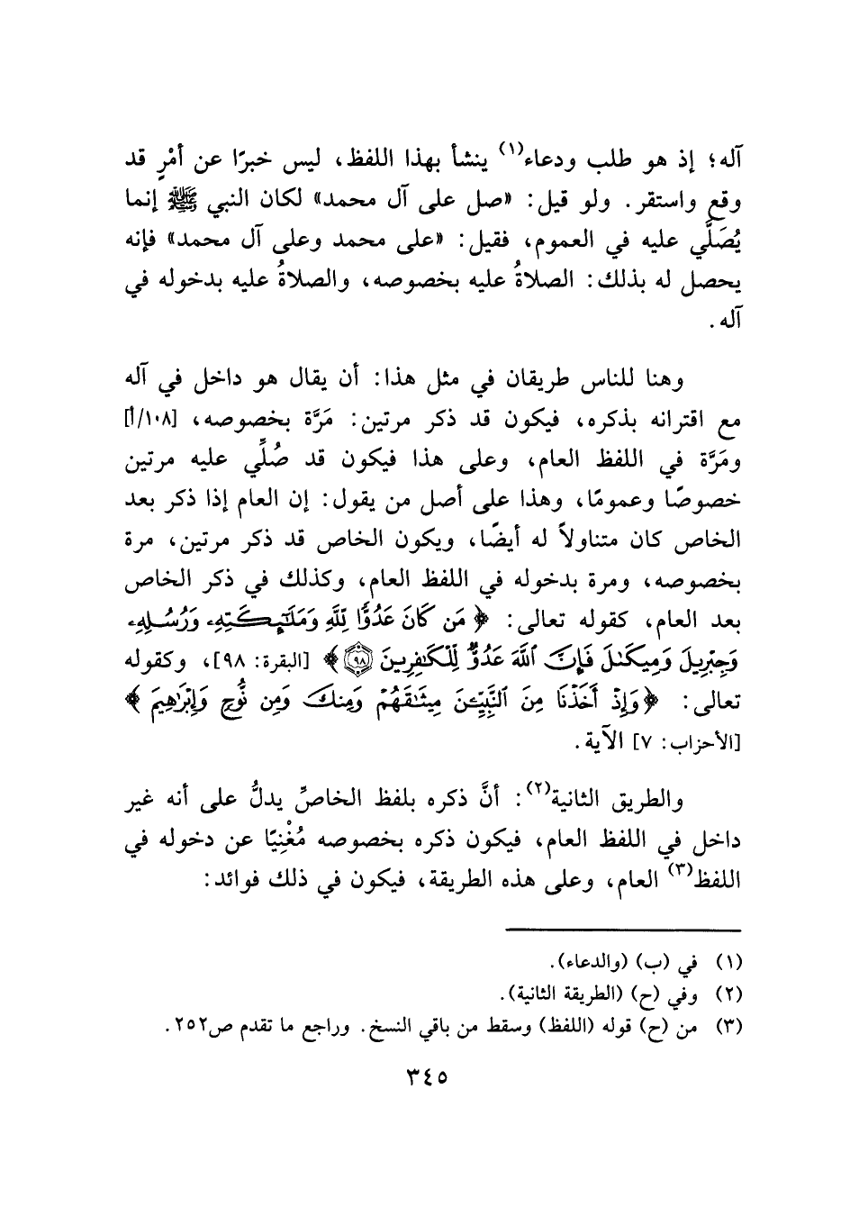 وهنا للناس طريقان في مثل هذا: أن يقال هو داخل في آله مع اقترانه بذكره، فيكون قد ذكر مرتين: مَرَّة بخصوصه، ومَرَّة في اللفظ العام، وعلى هذا فيكون قد صُلِّي عليه مرتين خصوصًا وعمومًا، وهذا على أصل من يقول: إن العام إذا ذكر بعد الخاص كان متناولًا له أيضًا، ويكون الخاص قد ذكر مرتين، مرة بخصوصه، ومرة بدخوله في اللفظ العام، وكذلك في ذكر الخاص بعد العام، كقوله تعالى: {مَنْ كَانَ عَدُوًّا لِلَّهِ وَمَلَائِكَتِهِ وَرُسُلِهِ وَجِبْرِيلَ وَمِيكَالَ فَإِنَّ اللَّهَ عَدُوٌّ لِلْكَافِرِينَ (٩٨)} [البقرة: ٩٨]، وكقوله تعالى: {وَإِذْ أَخَذْنَا مِنَ النَّبِيِّينَ مِيثَاقَهُمْ وَمِنْكَ وَمِنْ نُوحٍ وَإِبْرَاهِيمَ} [الأحزاب: ٧] الآية.