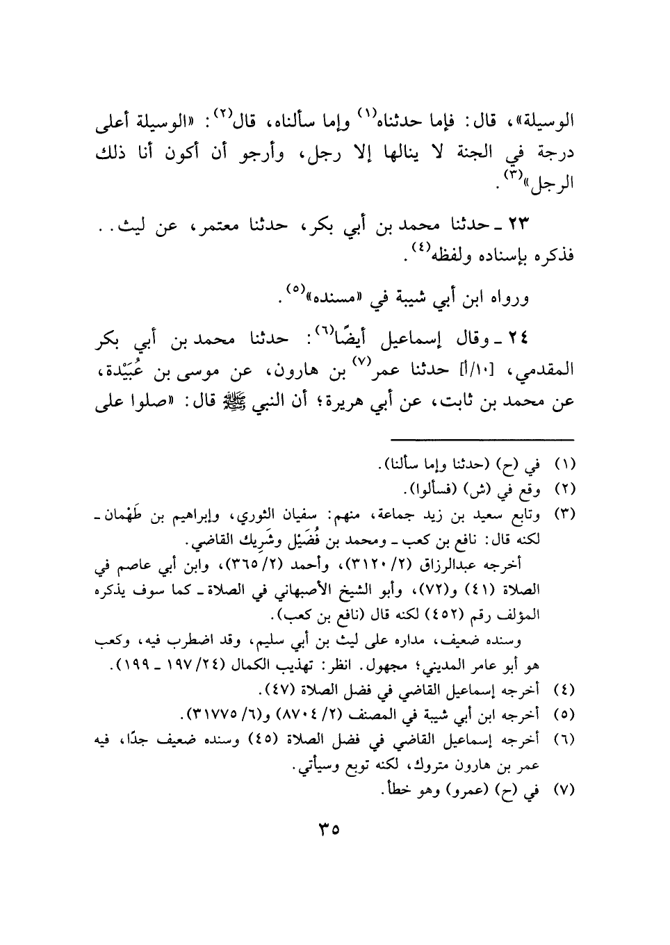 (¬٦) أخرجه إسماعيل القاضي في فضل الصلاة (٤٥) وسنده ضعيف جدًا، فيه عمر بن هارون متروك، لكنه توبع وسيأتي.