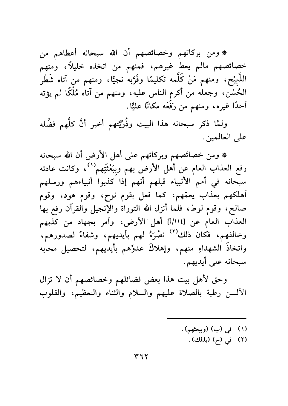 * ومن بركاتهم وخصائصهم أن الله سبحانه أعطاهم من خصائصهم ما لم يعط غيرهم، فمنهم من اتخذه خليلًا، ومنهم الذَّبيْح، ومنهم مَنْ كَلَّمه تكليمًا وقَرَّبه نجيًّا، ومنهم من آتاه شَطْر الحُسْن، وجعله من أكرم الناس عليه، ومنهم من آتاه مُلْكًا لم يؤته أحدًا غيره، ومنهم من رَفعَه مكانًا عليًّا.
